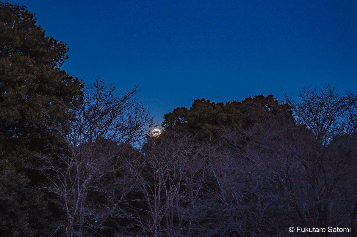 月の出は16時16分(千葉)、ふるさと広場だと月の出の時間からだいたい20分ほど経過してから月が見え始める。そのつもりで待っていたのだが、30分過ぎても月は見えてこない。西の空はあかね色、17時10分頃の日の入りを過ぎても、まだ見えてこない。1時間以上経過した17時30分過ぎに、やっと林の木々の間から見えた。