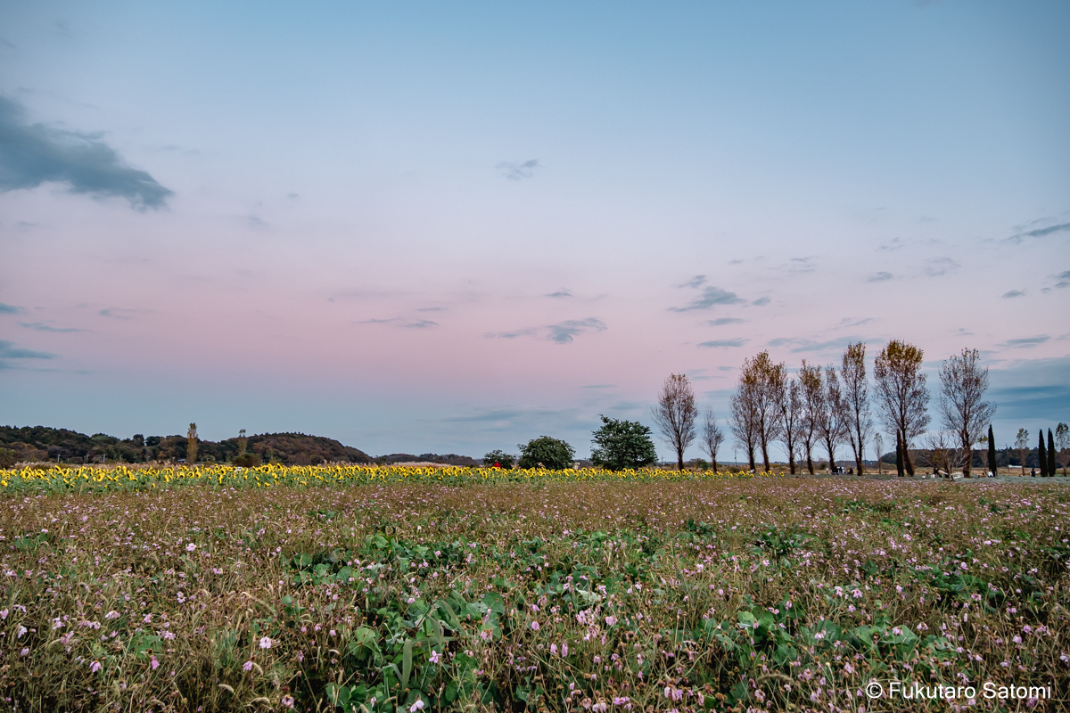 秋の花火大会 今日はだいぶ早めのクリスマスマーケット、夕方からは花火が打ち上げられた。日没後30分ほどたってからの打ち上げ、東の空は夕焼けの色をかすかに映していて、コスモスは盛りを過ぎていたが、遅咲きのヒマワリはまだ遠目にはきれいに咲きそろって見えて、この季節のこの時間帯の花火もなかなか趣があった。 打ち上げの時間は約10分ほどだったが、近くで見る花火は、体に響く大きな音も加わって見応え十分だった。