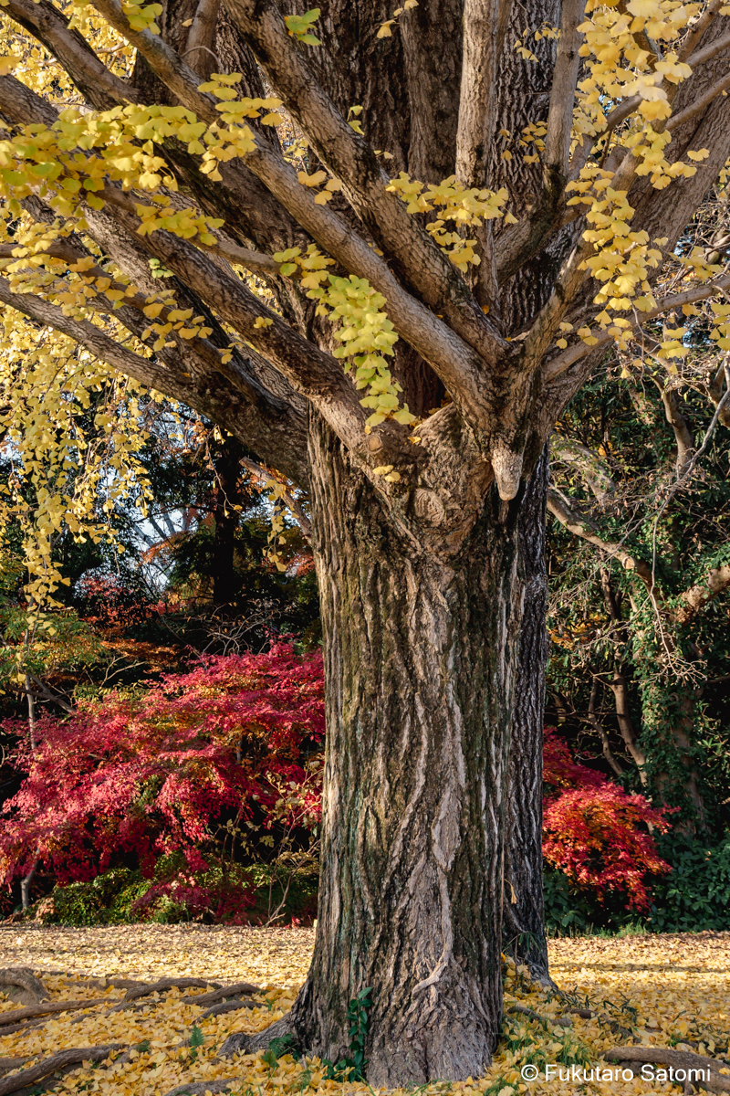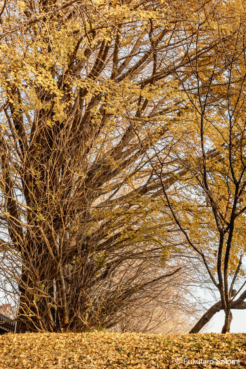 実際に月がイチョウ並木の背後に見え始めたのは4時40分頃だった。その頃はまだ明るさは残っていたが、イチョウ並木の上に昇る頃には、あたりはすっかり暗くなっていた。こうなってからの撮影は、周囲が闇の中に沈んでしまって一気に難しくなる。前日の4日は十五夜で満月度は99.5%、月の出はほぼ一時間早い15時24分、周囲の景色を取り込んだ写真を撮るには、その日の方が条件が良かったのだった。