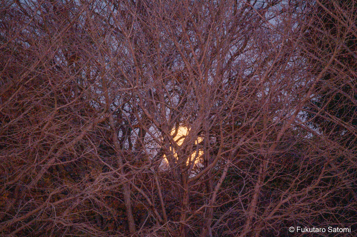 先日城址公園の自由広場で撮影した際、月が昇ってくる方角の確認ができたので、今回の満月は、葉をすっかり落としたイチョウ並木の上に昇る月を撮ることにした。寒波が列島に到来しているそうで、陽が落ちてからは一段と冷え込みが厳しくなってきた。