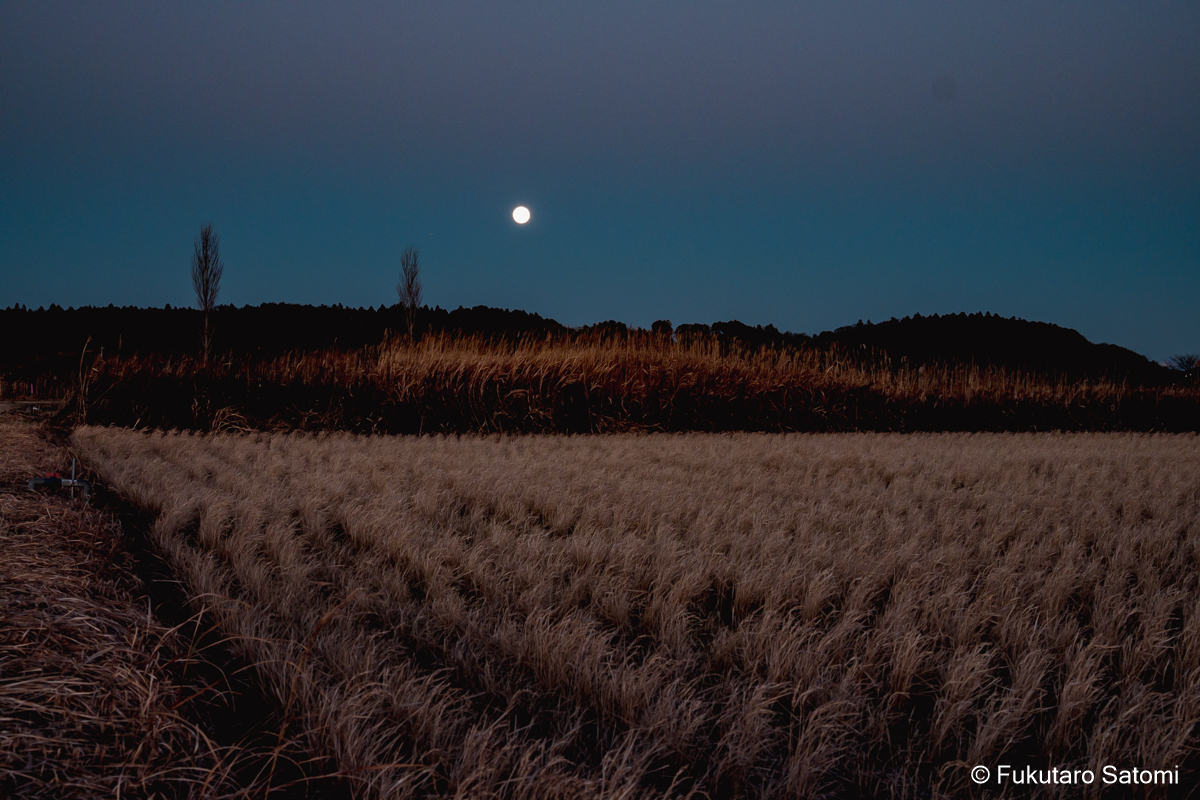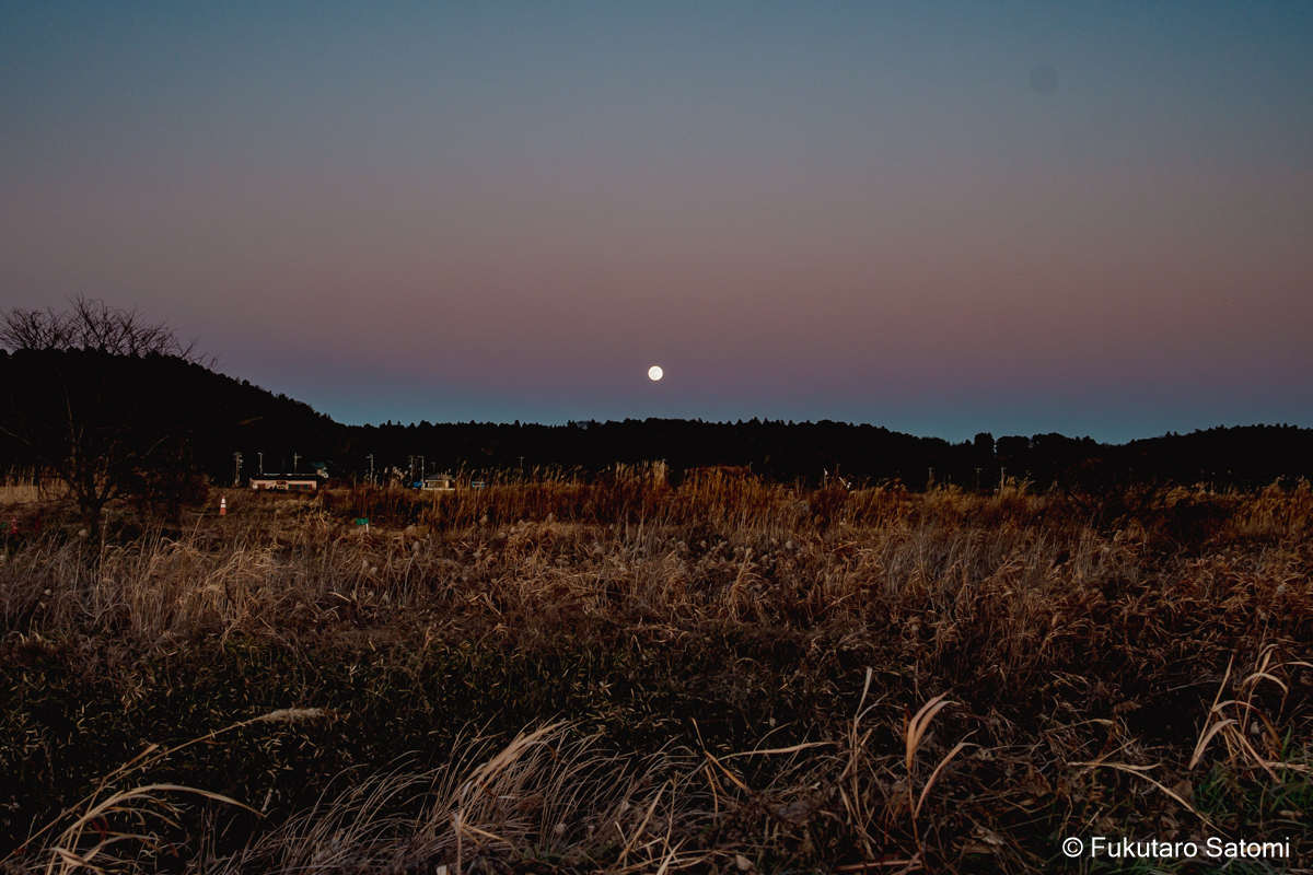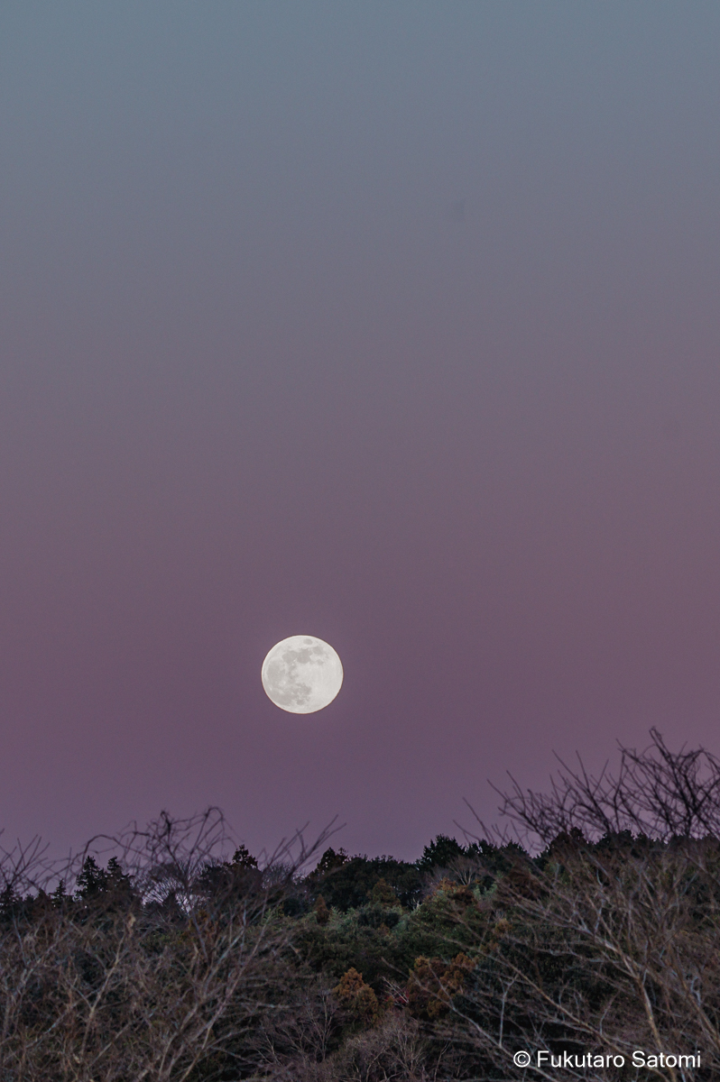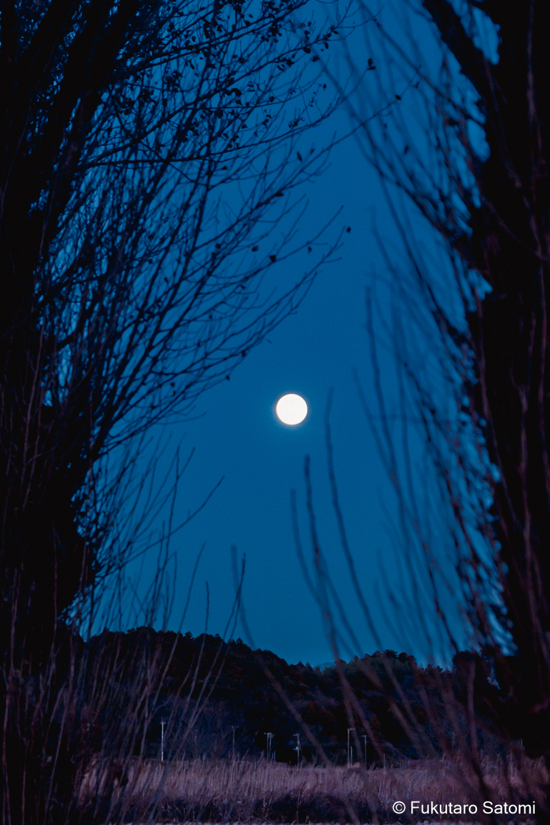 マジックアワーのアイスムーン 満月の昇り始めは、オレンジ色に染まって大きく見えることが多い。冬の寒い時期は、凍てつく空気の中、氷の球体のように白く見える。以前にもそう呼んだことがあったが、今回も「アイスムーン」と呼ぶことにした。