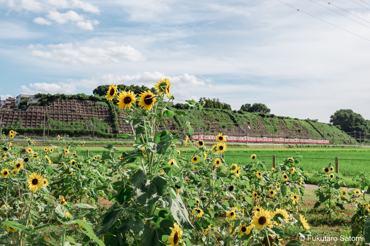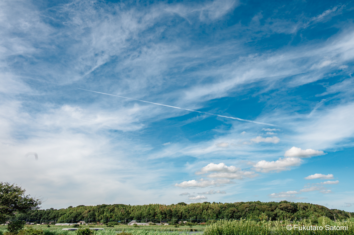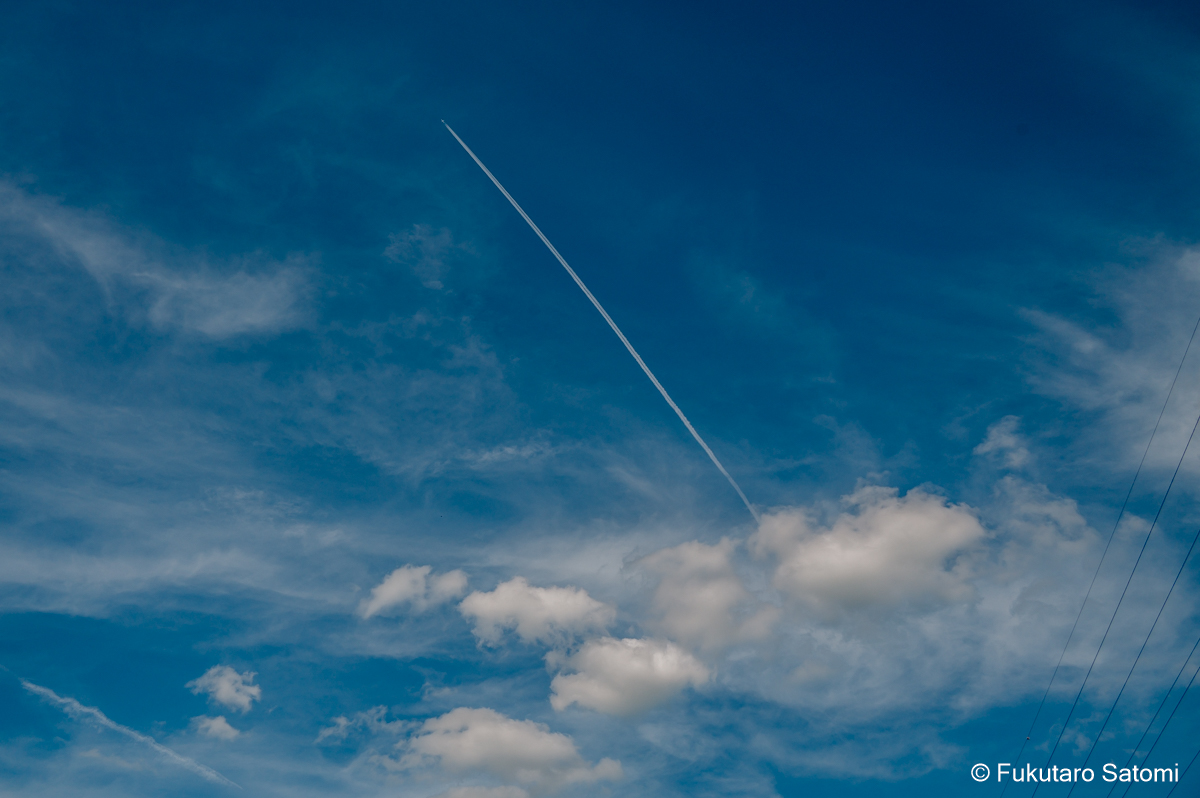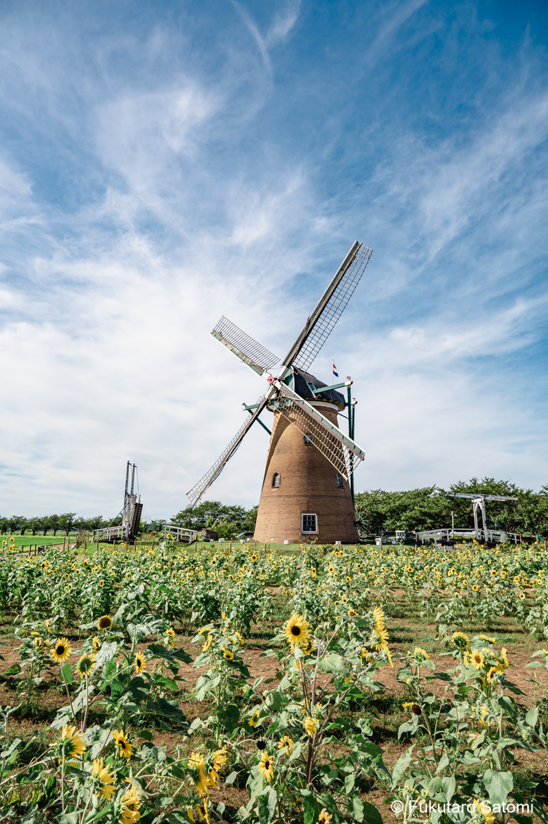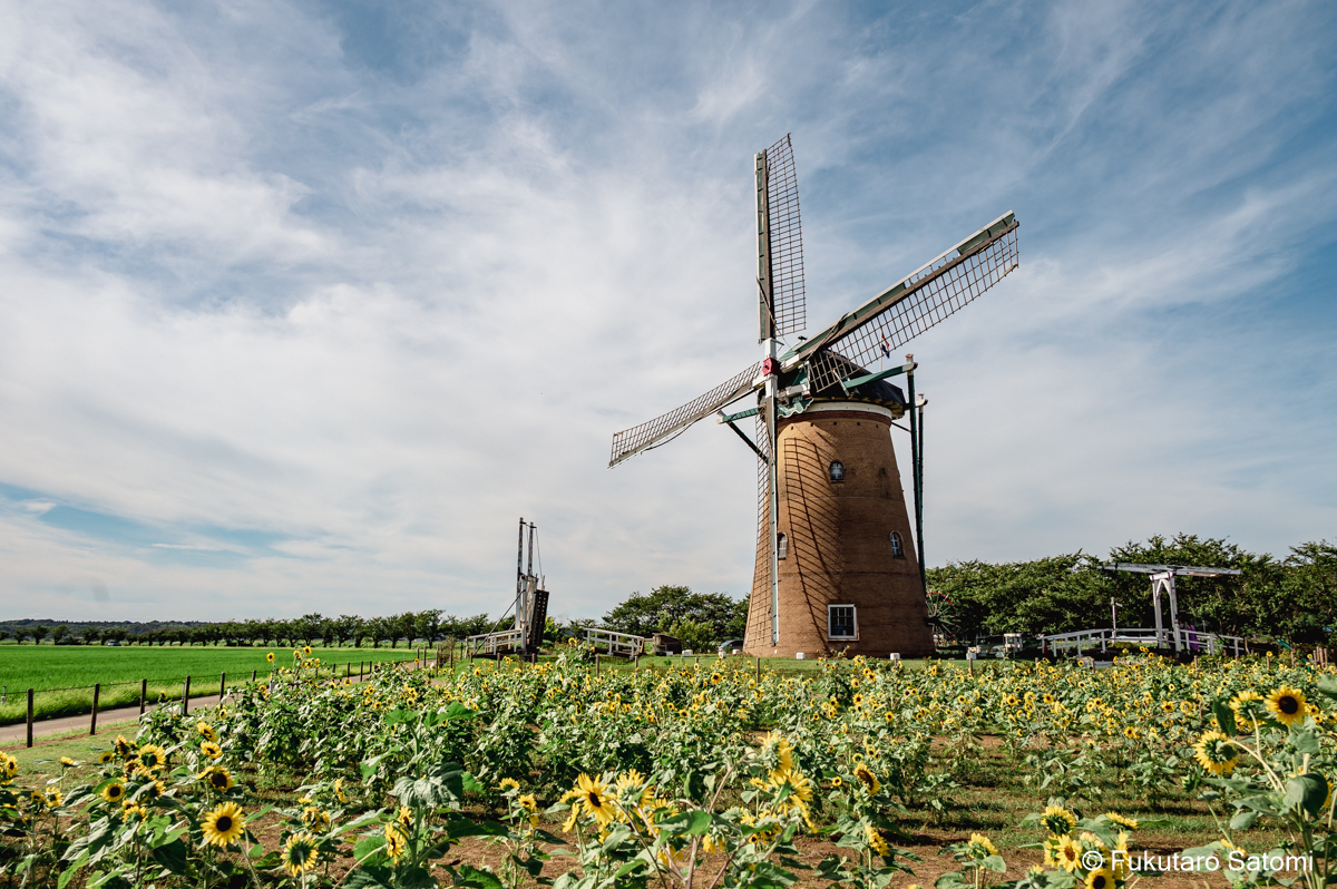 ふるさと広場のひまわり畑とケムトレイル? 毎年実施されてきた「風車のひまわりガーデン」は、ふるさと広場とその周辺のリニューアル工事のため今年は開催されないが、小規模ながら広場ではひまわりが咲いていた。 ケムトレイル?