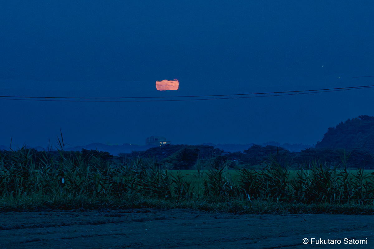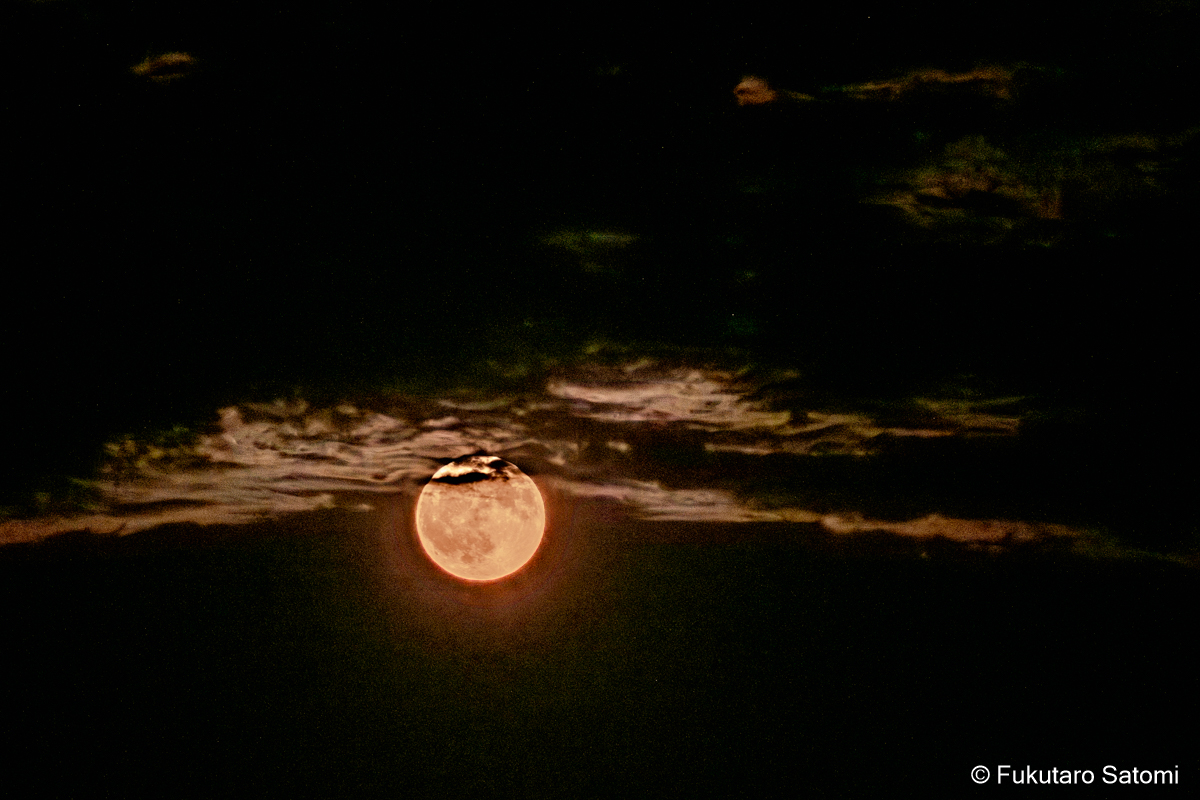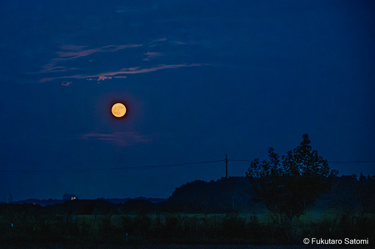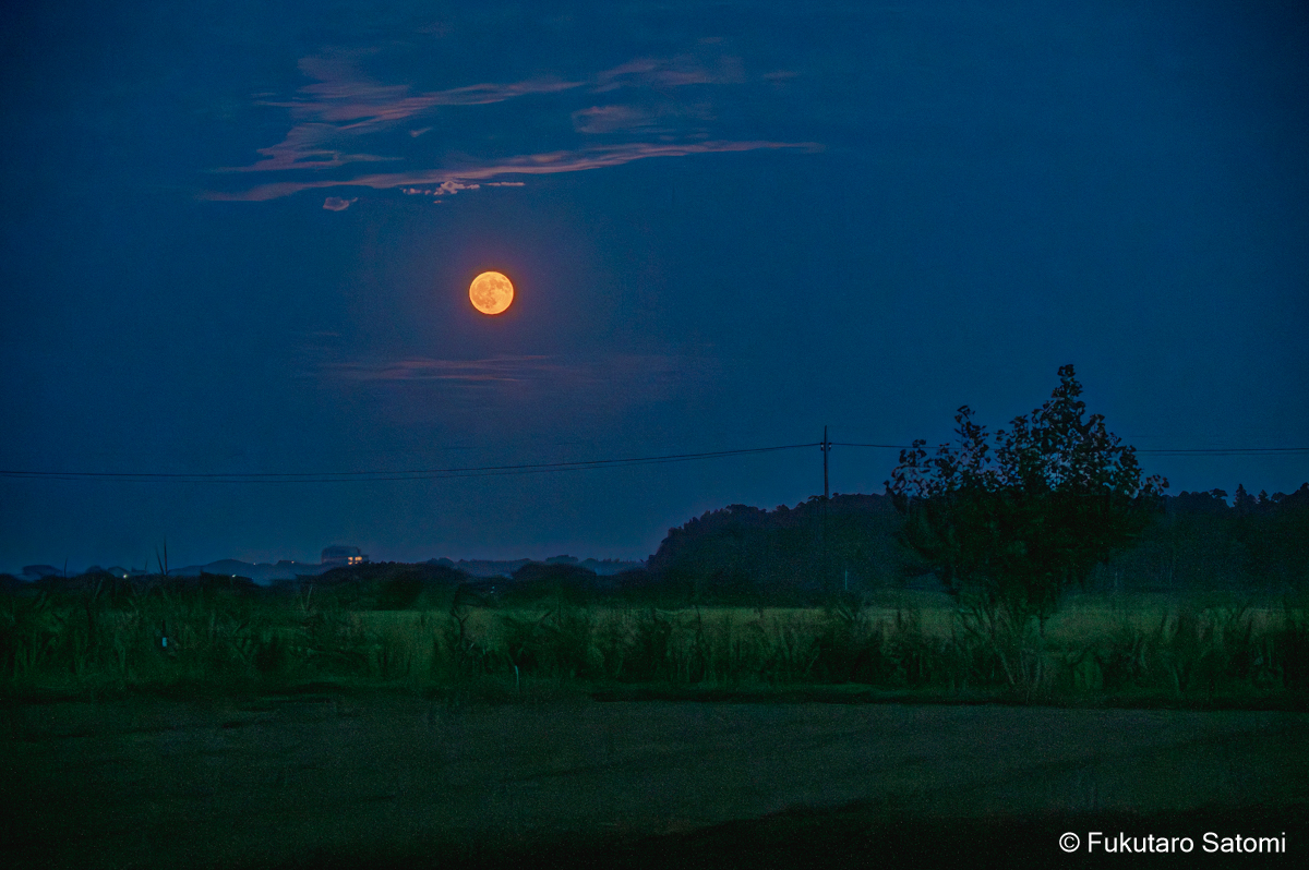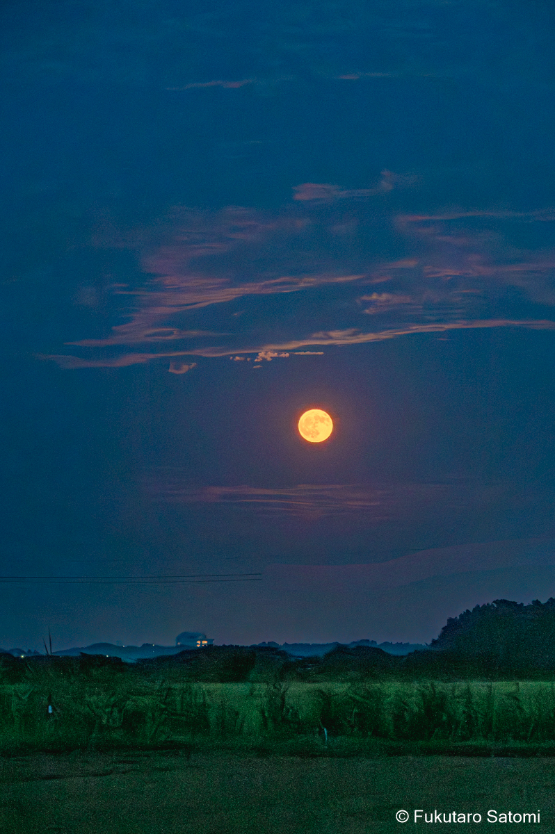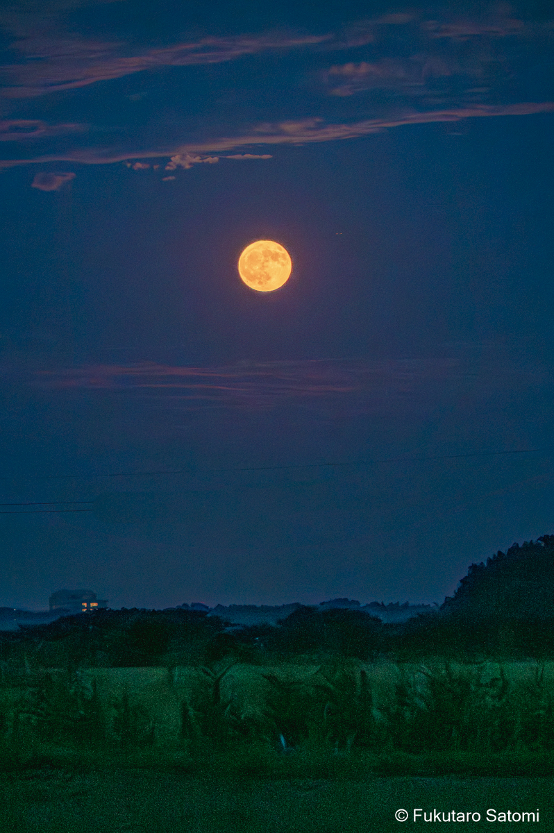 8月の満月 日中の空は雲で覆われ、満月の撮影は半ばあきらめムードだったが、それでも夕方から天気は回復するという天気予報に望みを託していたところ、その予報がピタリと当たった。 このあたりの田んぼは水不足でひび割れることもなく、稲は順調に育っているようだ。 地上付近は雲が多く、少し昇った頃からやっと見え始めた。