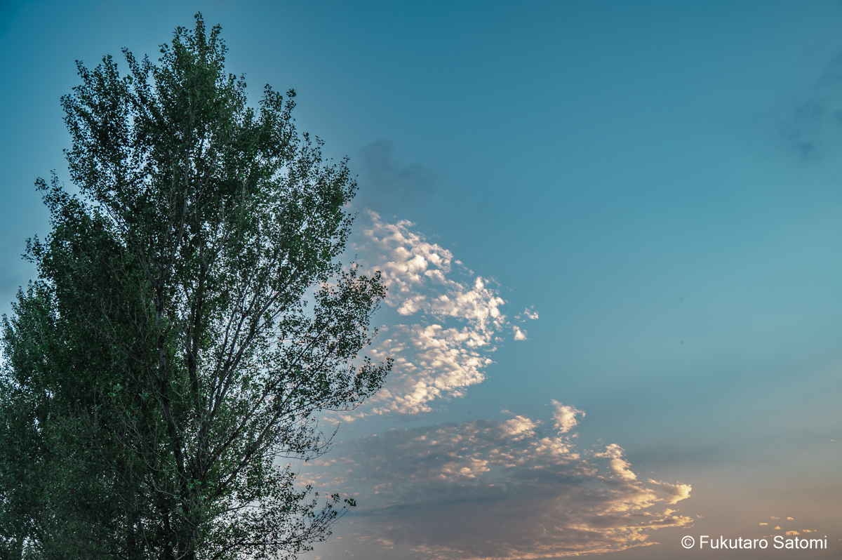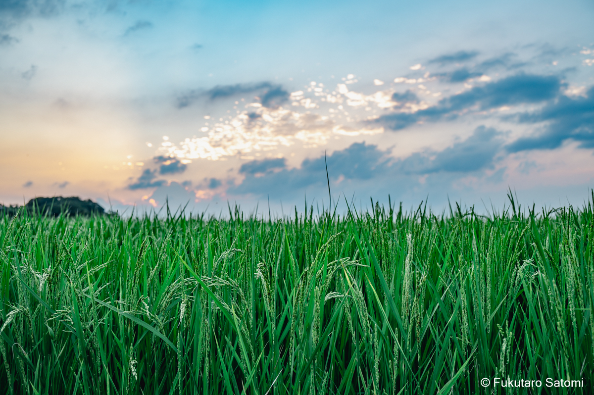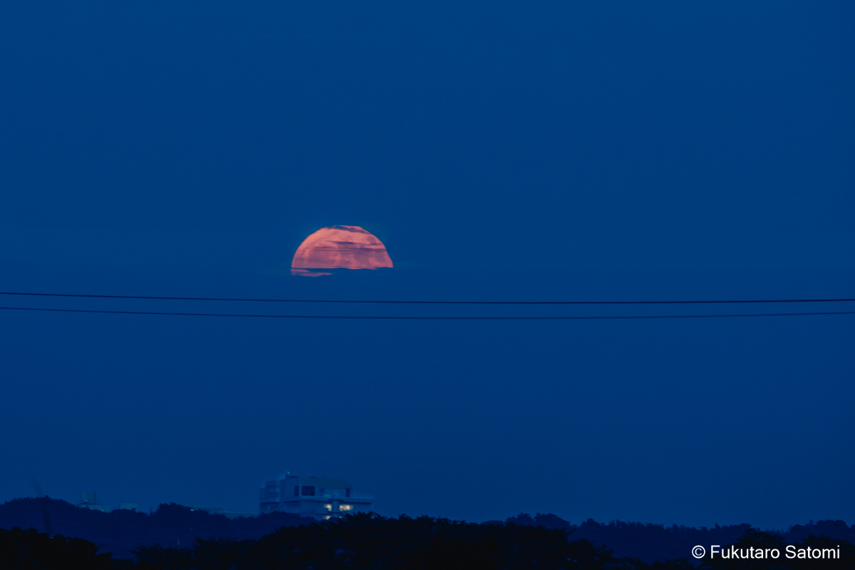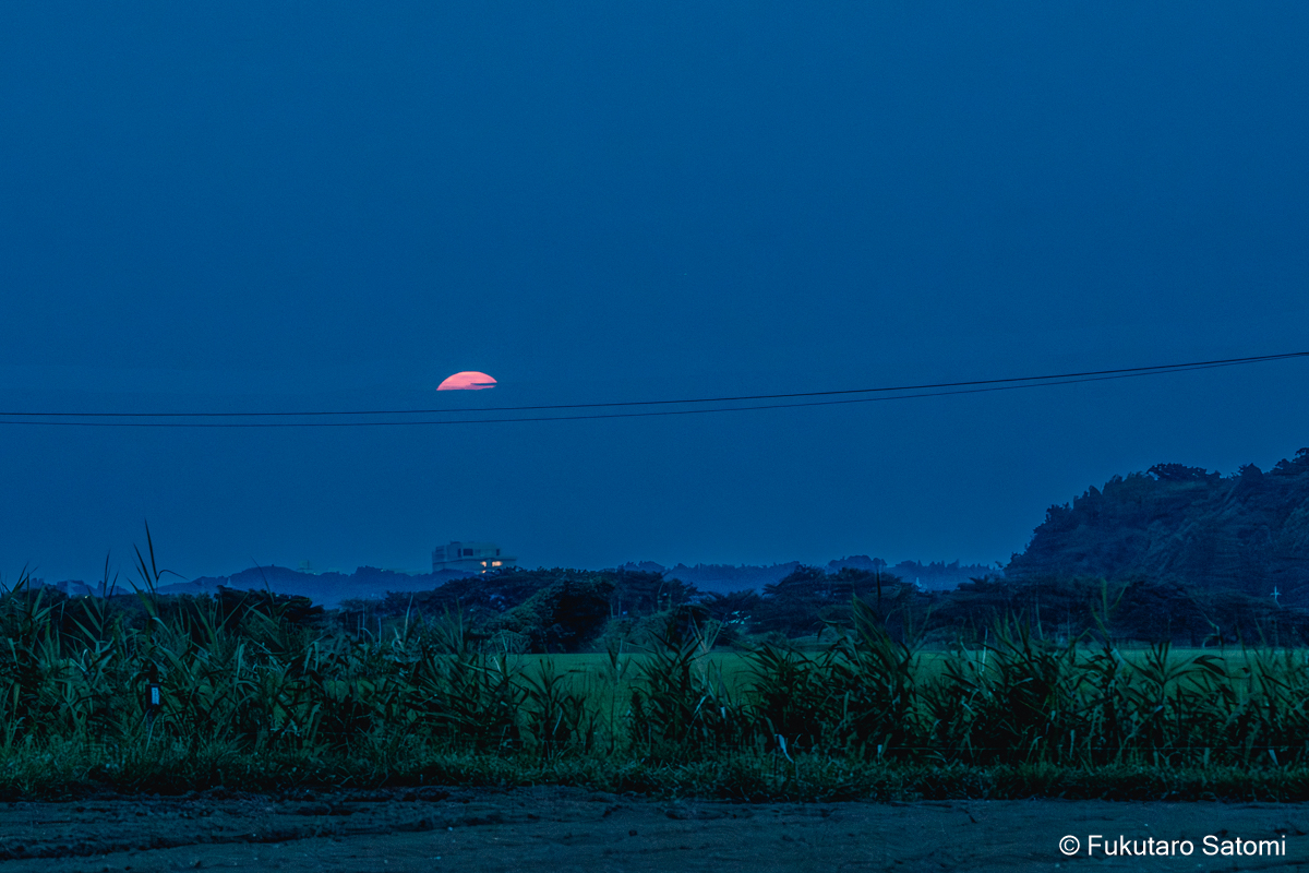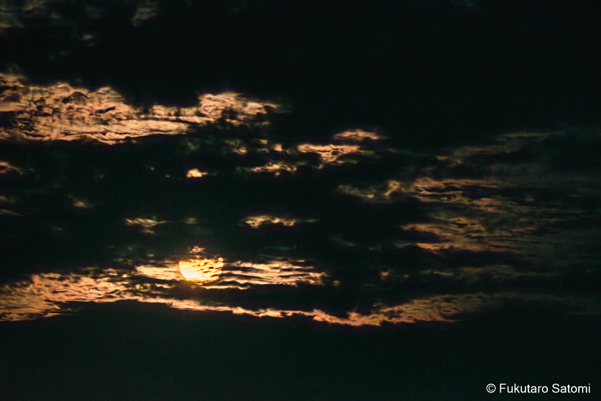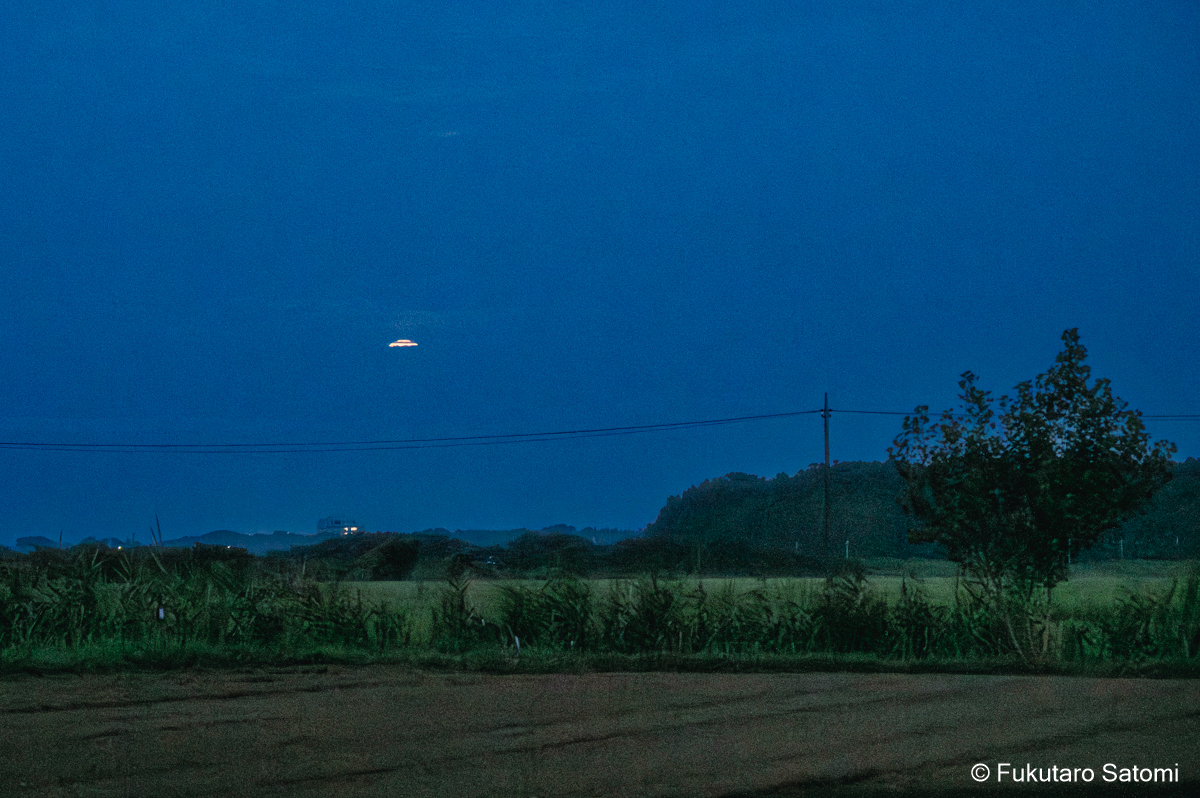 8月の満月 日中の空は雲で覆われ、満月の撮影は半ばあきらめムードだったが、それでも夕方から天気は回復するという天気予報に望みを託していたところ、その予報がピタリと当たった。 このあたりの田んぼは水不足でひび割れることもなく、稲は順調に育っているようだ。 地上付近は雲が多く、少し昇った頃からやっと見え始めた。