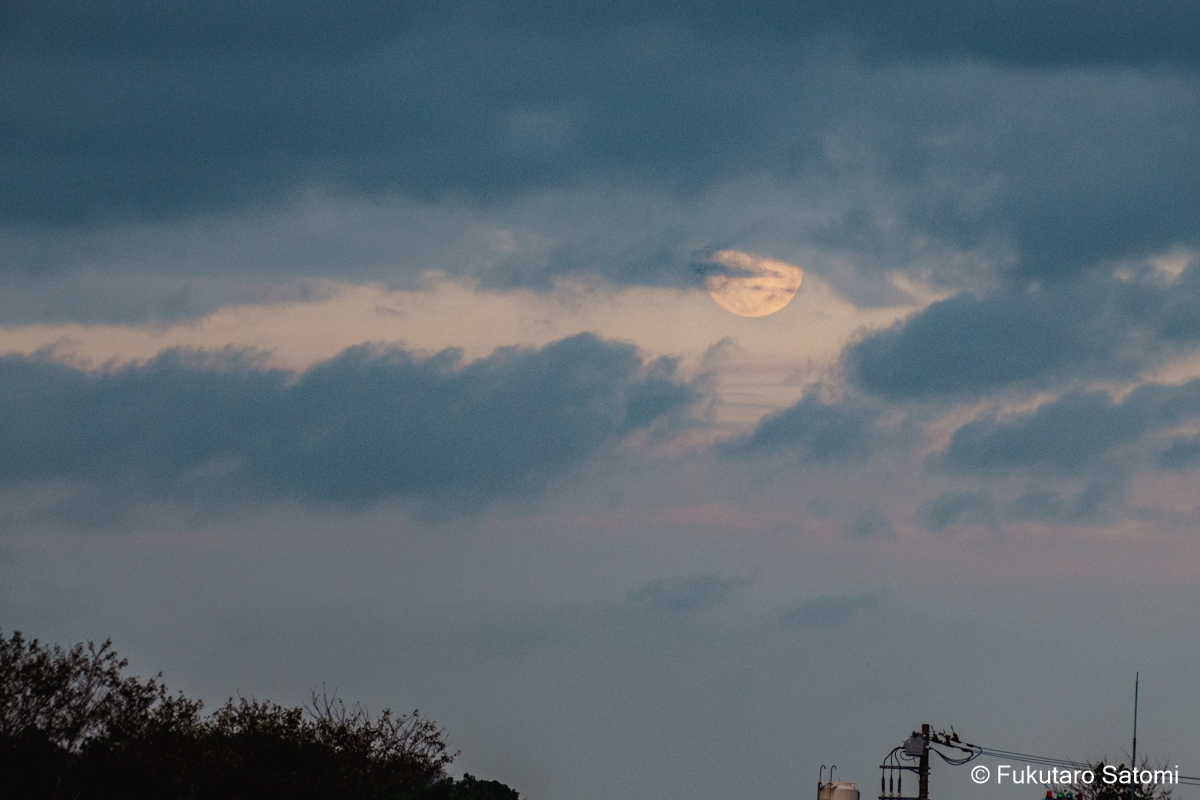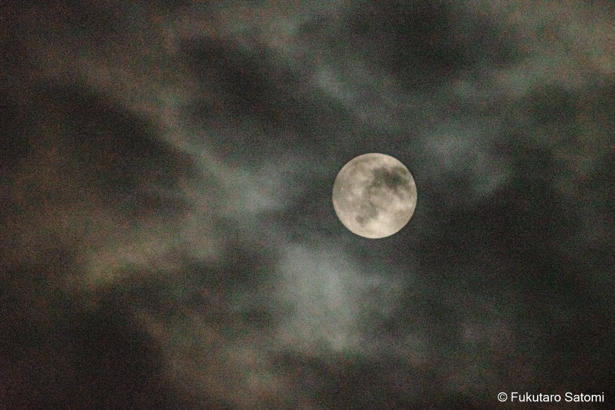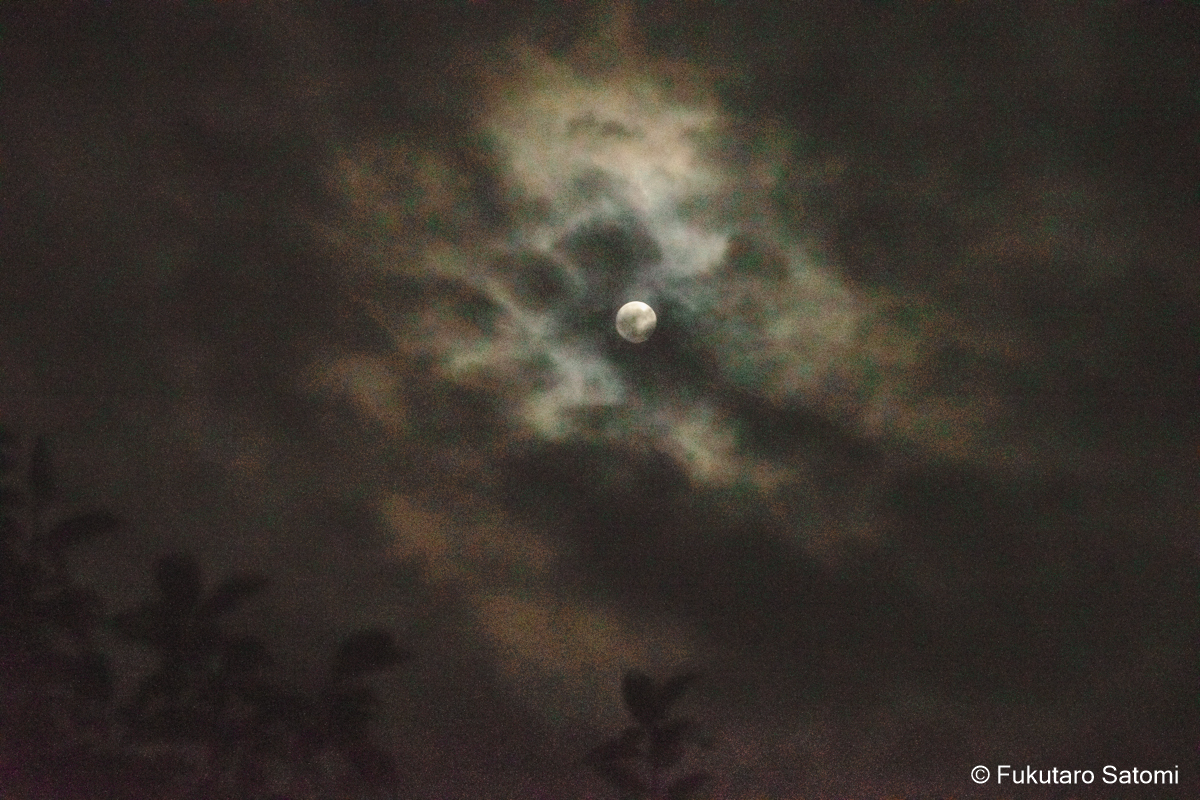 仲秋の名月 満月一日前の10月7日は仲秋の名月、日中から曇り空で、今夜の月見は難しいかなとは思うものの、可能性は零ではないだろうと期待を込めて撮影に出かけてみた。 やはり雲が多かったが、風に流されてゆっくりと移動する。 少し昇ってから、雲の切れ目から下側が見えることがあったが、すぐに雲の中に消えて行ってしまった。ほんの一週でも名月をとらえることができた。残念なことだが、それをもって、よしとするより仕方がない。 家に戻ってから、時々空を見上げてみた。雲間から見え隠れすることが、何度かあった。