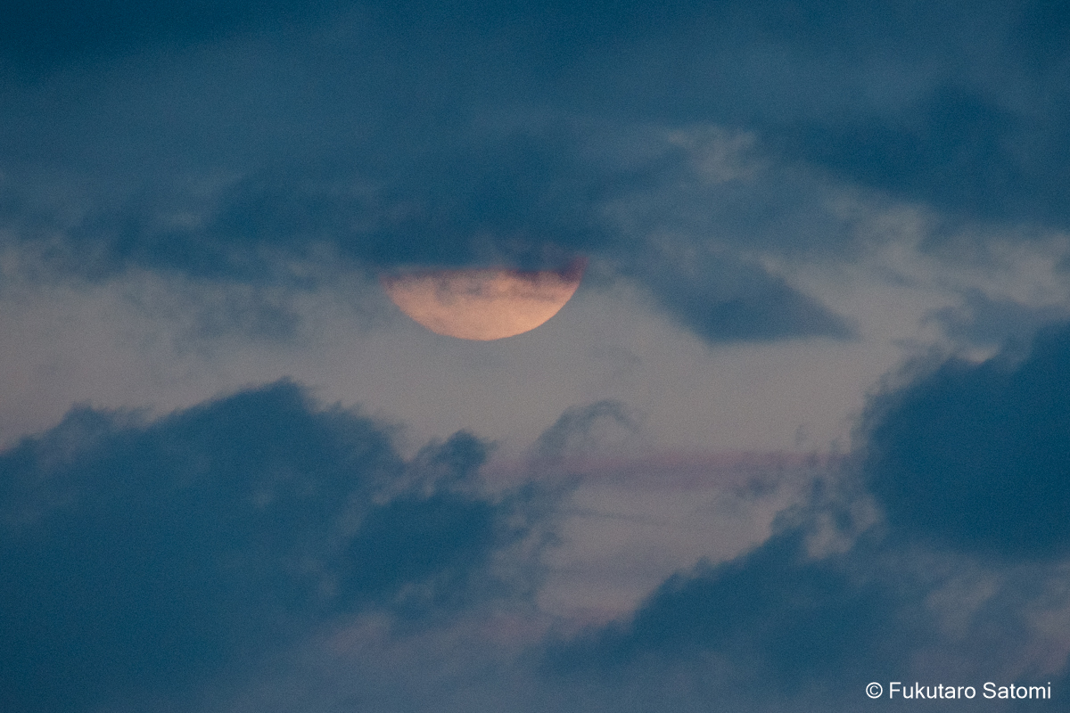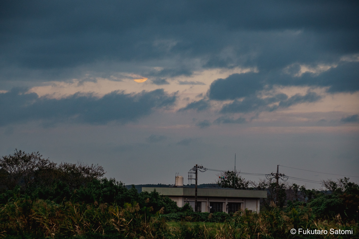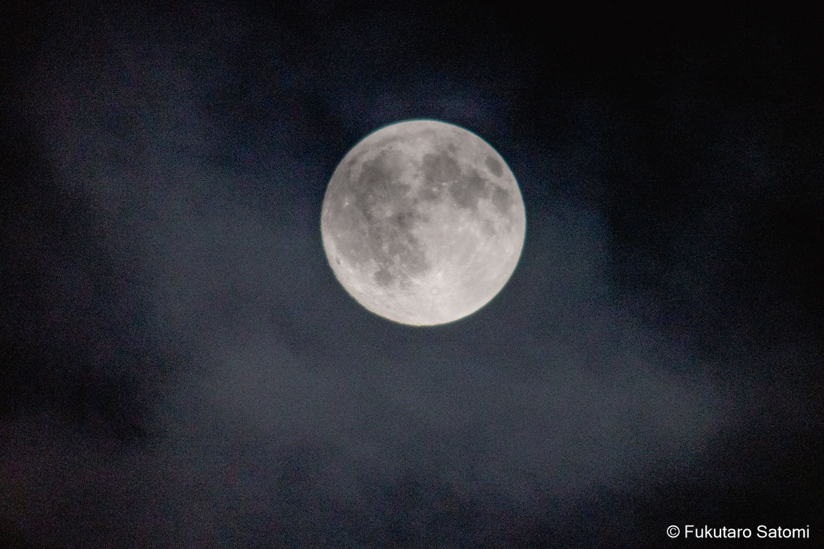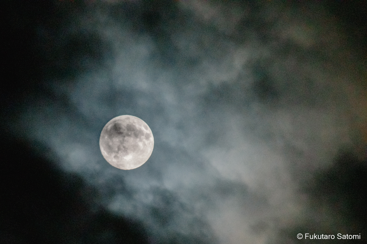 仲秋の名月 満月一日前の10月7日は仲秋の名月、日中から曇り空で、今夜の月見は難しいかなとは思うものの、可能性は零ではないだろうと期待を込めて撮影に出かけてみた。 やはり雲が多かったが、風に流されてゆっくりと移動する。 少し昇ってから、雲の切れ目から下側が見えることがあったが、すぐに雲の中に消えて行ってしまった。ほんの一週でも名月をとらえることができた。残念なことだが、それをもって、よしとするより仕方がない。 家に戻ってから、時々空を見上げてみた。雲間から見え隠れすることが、何度かあった。