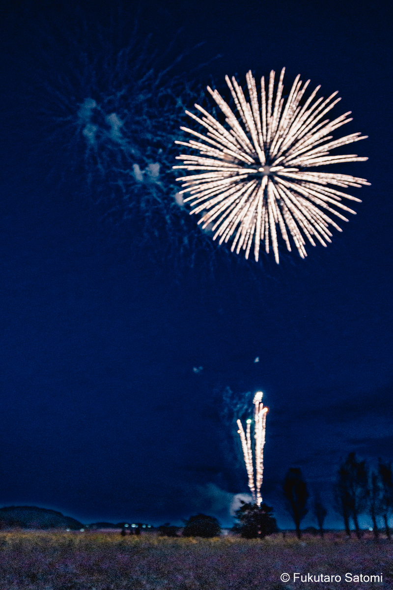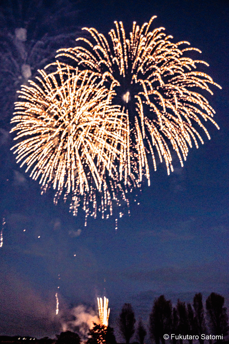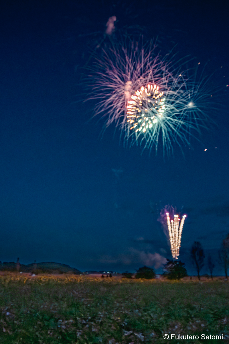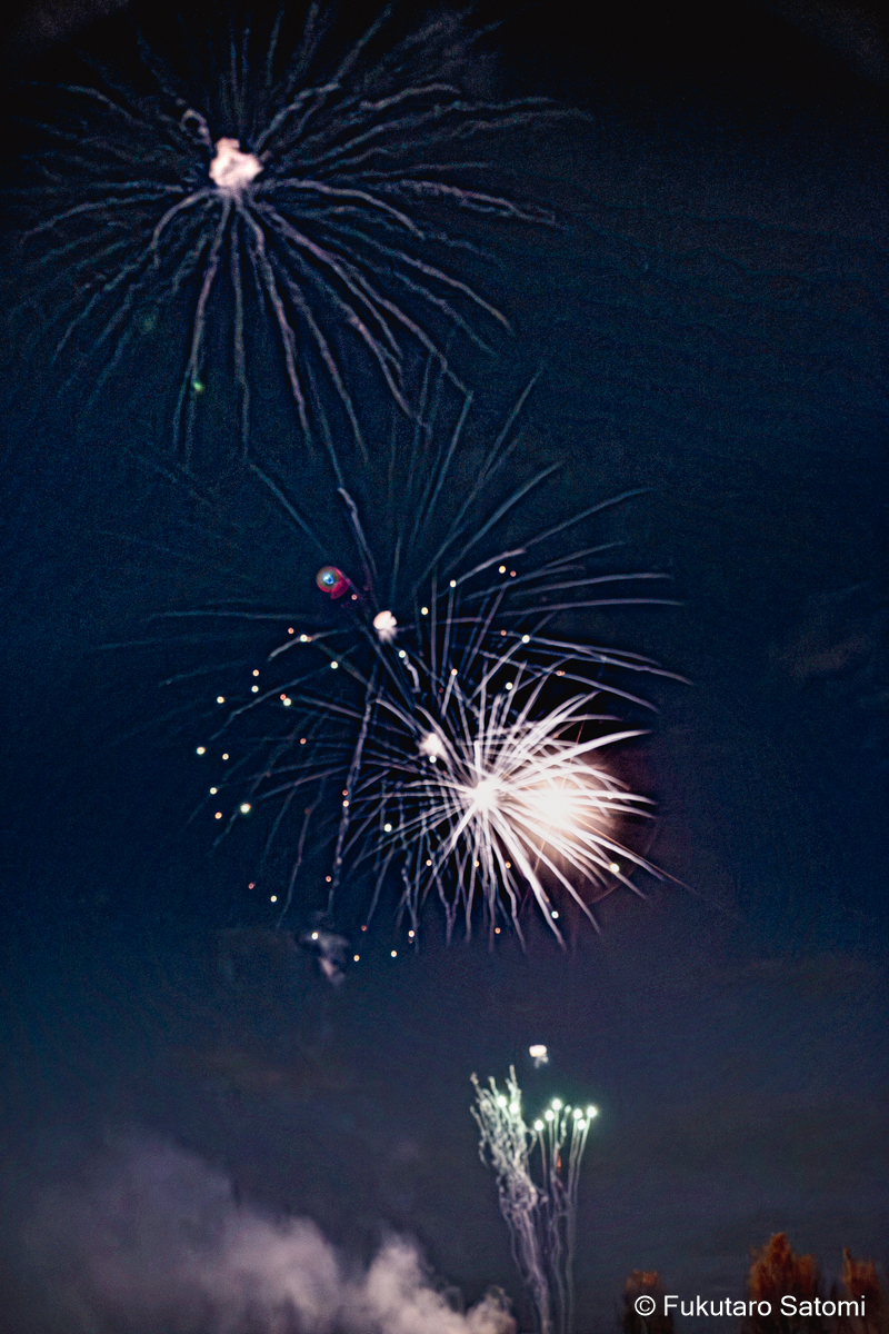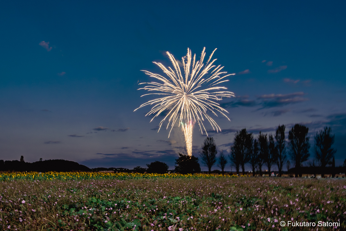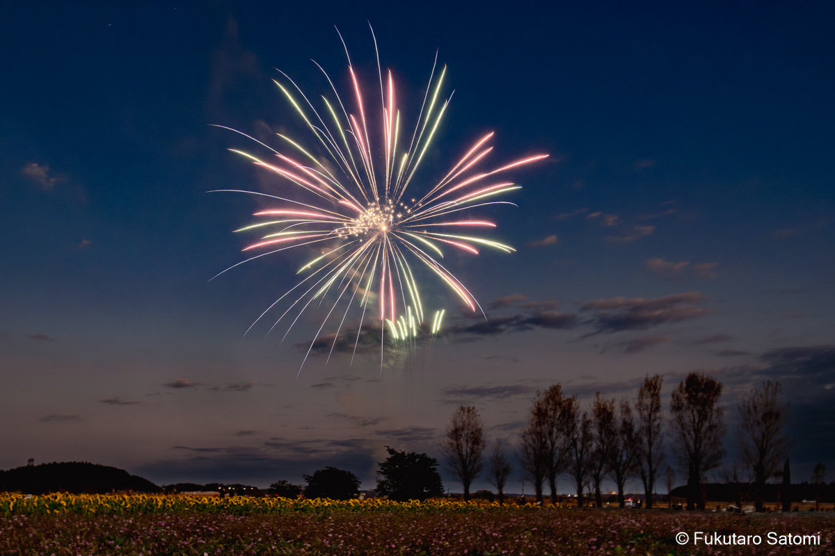 秋の花火大会 今日はだいぶ早めのクリスマスマーケット、夕方からは花火が打ち上げられた。日没後30分ほどたってからの打ち上げ、東の空は夕焼けの色をかすかに映していて、コスモスは盛りを過ぎていたが、遅咲きのヒマワリはまだ遠目にはきれいに咲きそろって見えて、この季節のこの時間帯の花火もなかなか趣があった。 打ち上げの時間は約10分ほどだったが、近くで見る花火は、体に響く大きな音も加わって見応え十分だった。