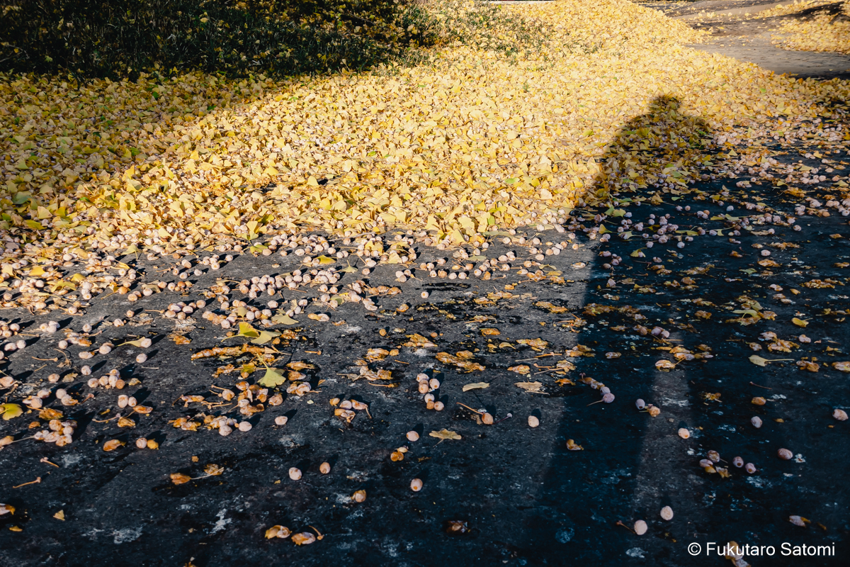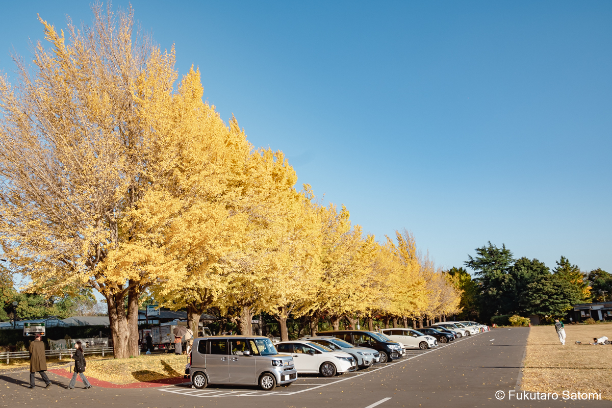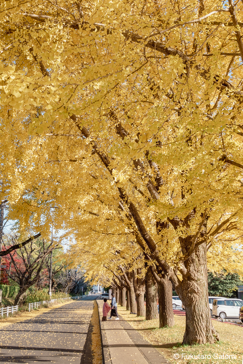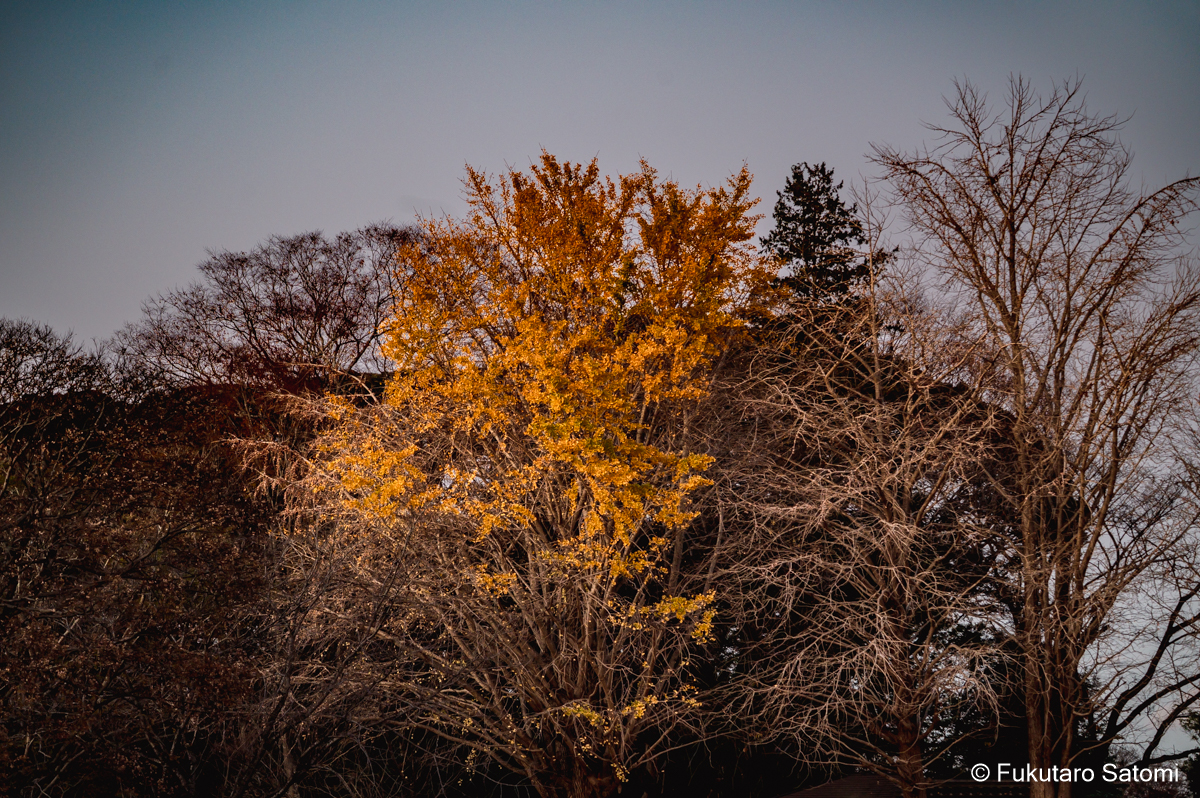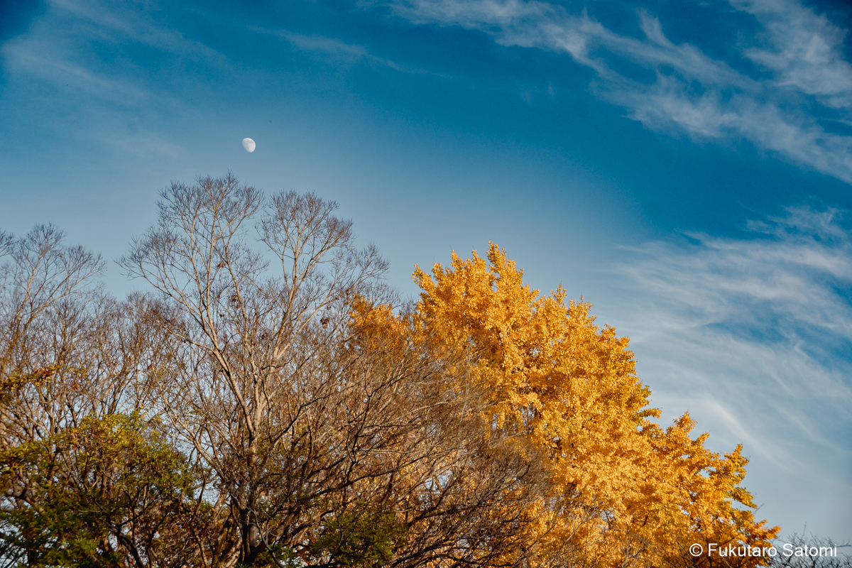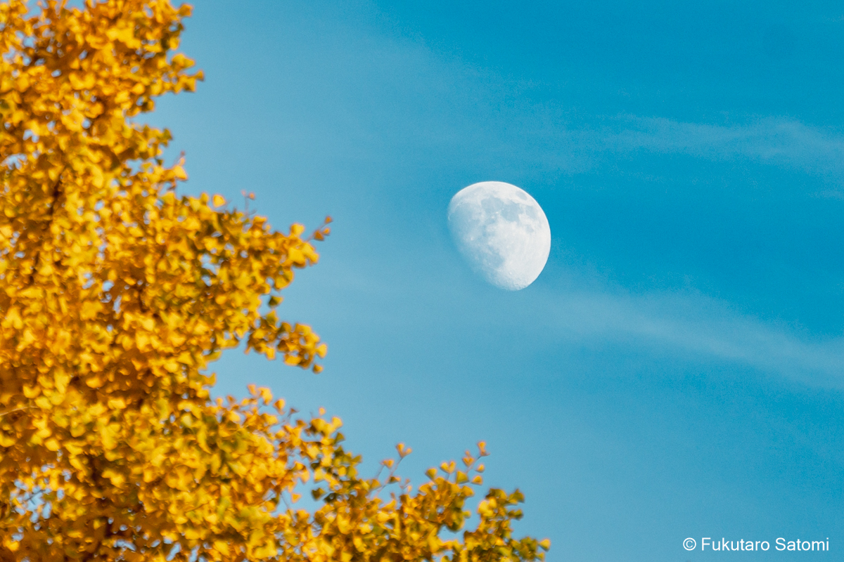 実際に月がイチョウ並木の背後に見え始めたのは4時40分頃だった。その頃はまだ明るさは残っていたが、イチョウ並木の上に昇る頃には、あたりはすっかり暗くなっていた。こうなってからの撮影は、周囲が闇の中に沈んでしまって一気に難しくなる。前日の4日は十五夜で満月度は99.5%、月の出はほぼ一時間早い15時24分、周囲の景色を取り込んだ写真を撮るには、その日の方が条件が良かったのだった。