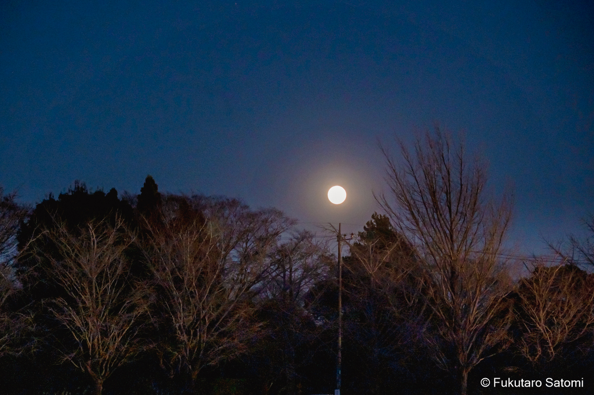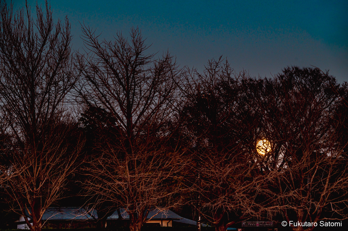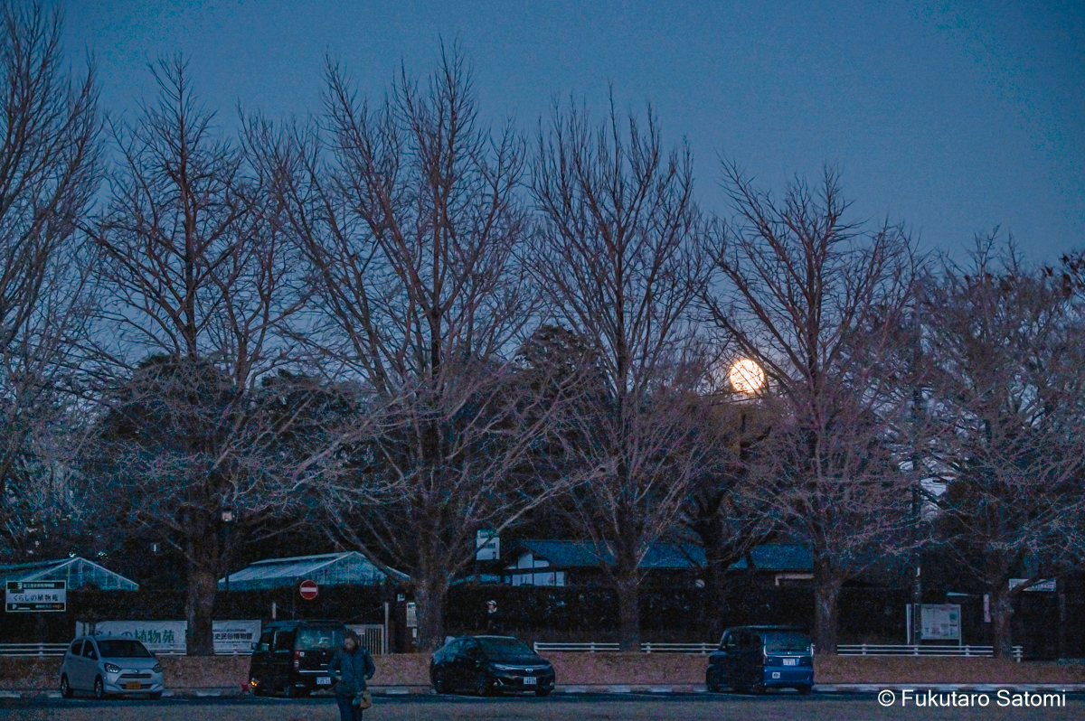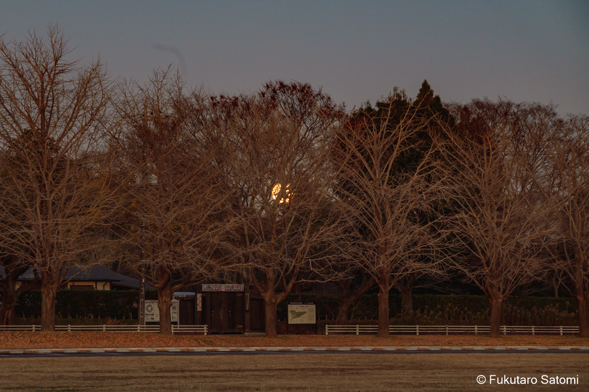 先日城址公園の自由広場で撮影した際、月が昇ってくる方角の確認ができたので、今回の満月は、葉をすっかり落としたイチョウ並木の上に昇る月を撮ることにした。寒波が列島に到来しているそうで、陽が落ちてからは一段と冷え込みが厳しくなってきた。