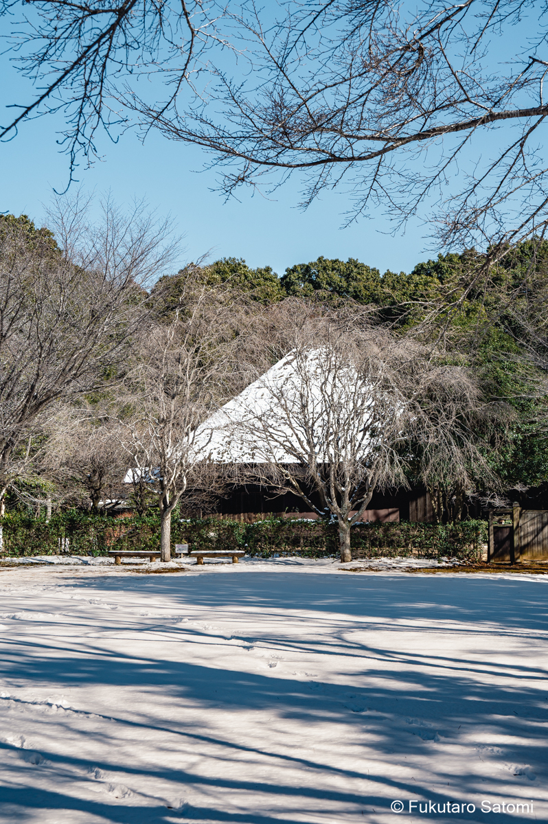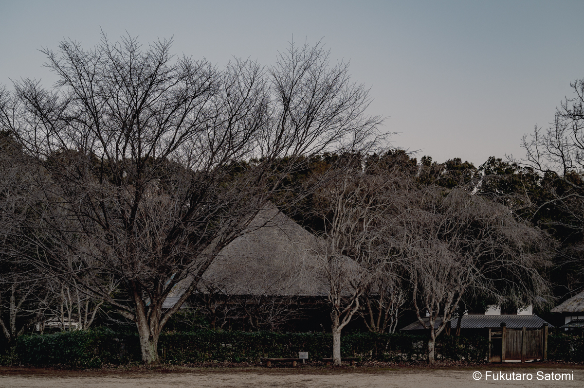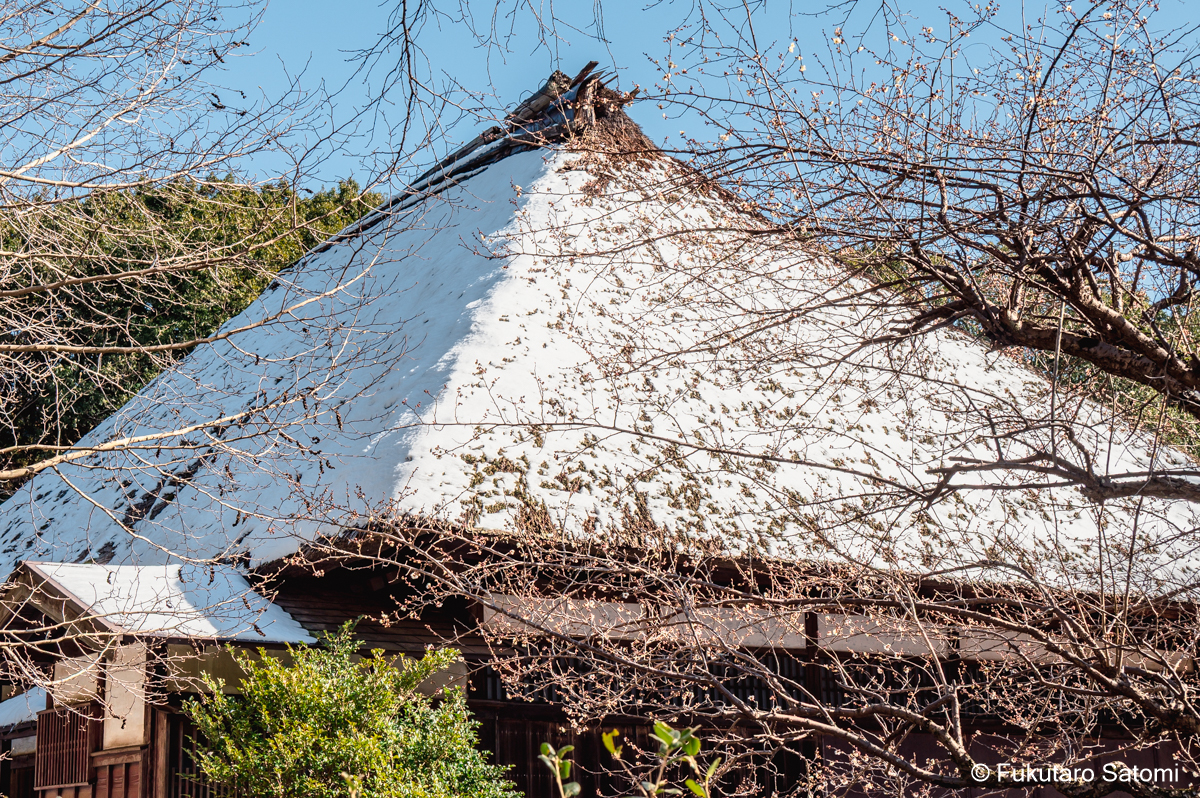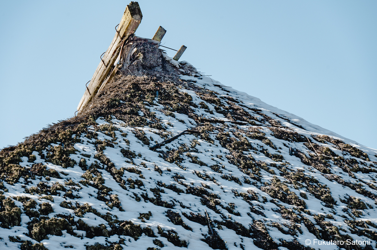2月1日は小望月、満月ではないけれど満月度99.7で、肉眼ではもう満月に見える。今回は藁葺き屋根の上に昇る満月という趣向、日没前のまだ明るい時分から撮影したかったので、満月の一日前の小望月の日に出かけたのだった。