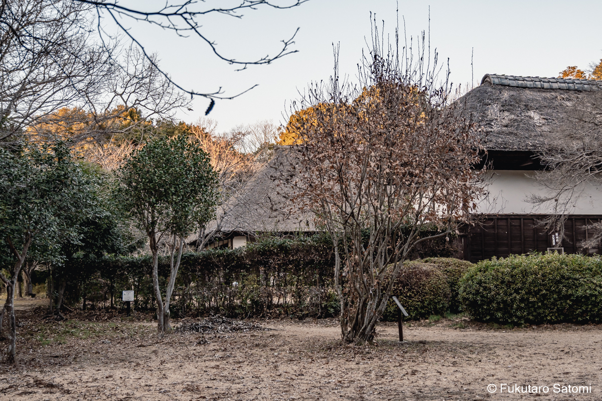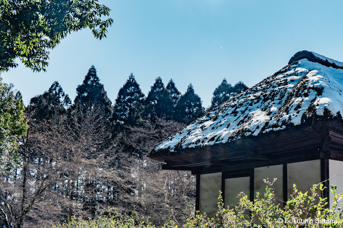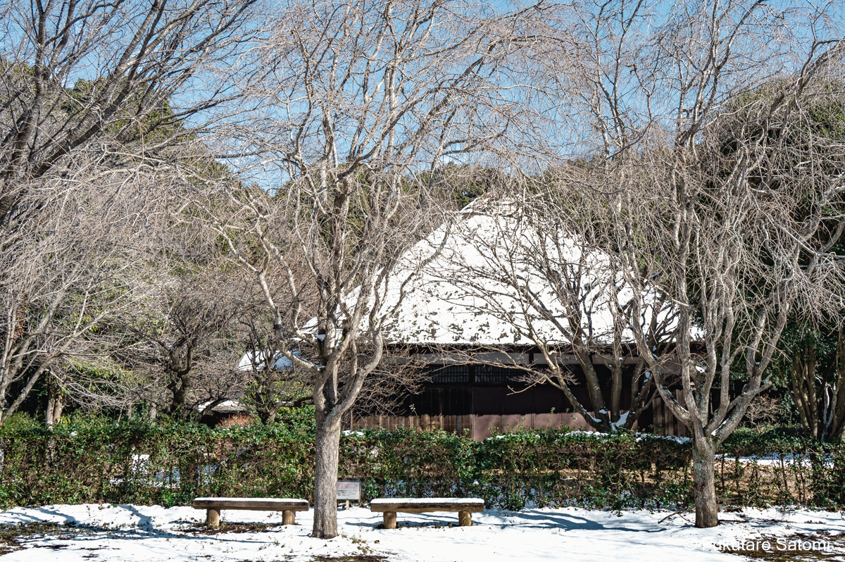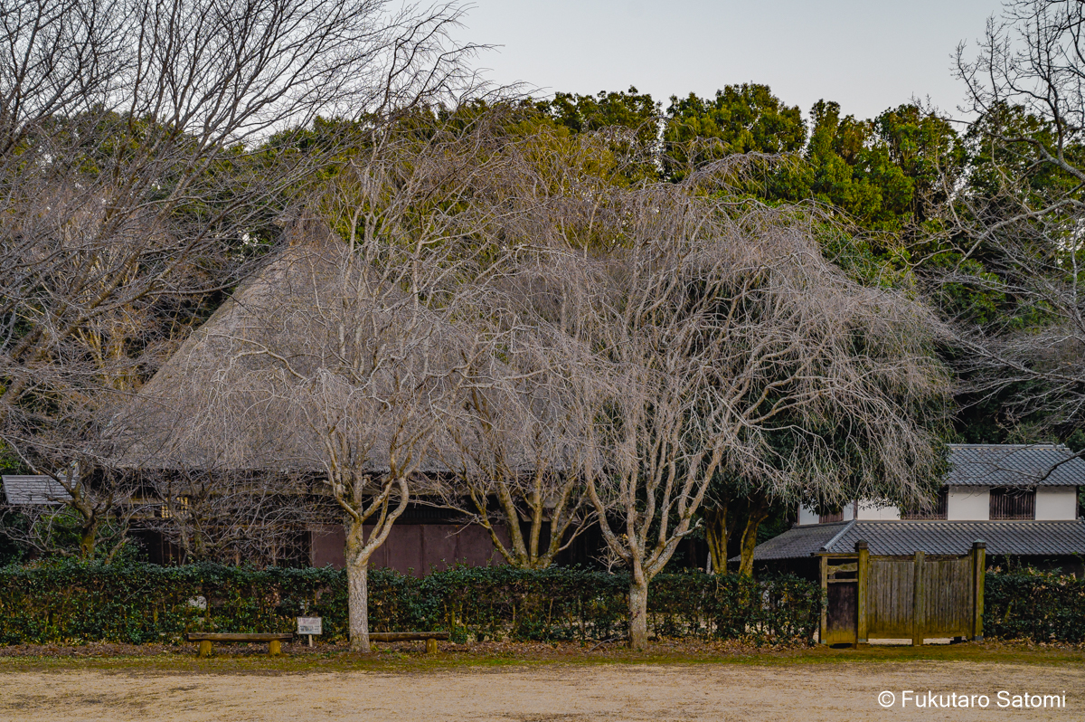 2月1日は小望月、満月ではないけれど満月度99.7で、肉眼ではもう満月に見える。今回は藁葺き屋根の上に昇る満月という趣向、日没前のまだ明るい時分から撮影したかったので、満月の一日前の小望月の日に出かけたのだった。