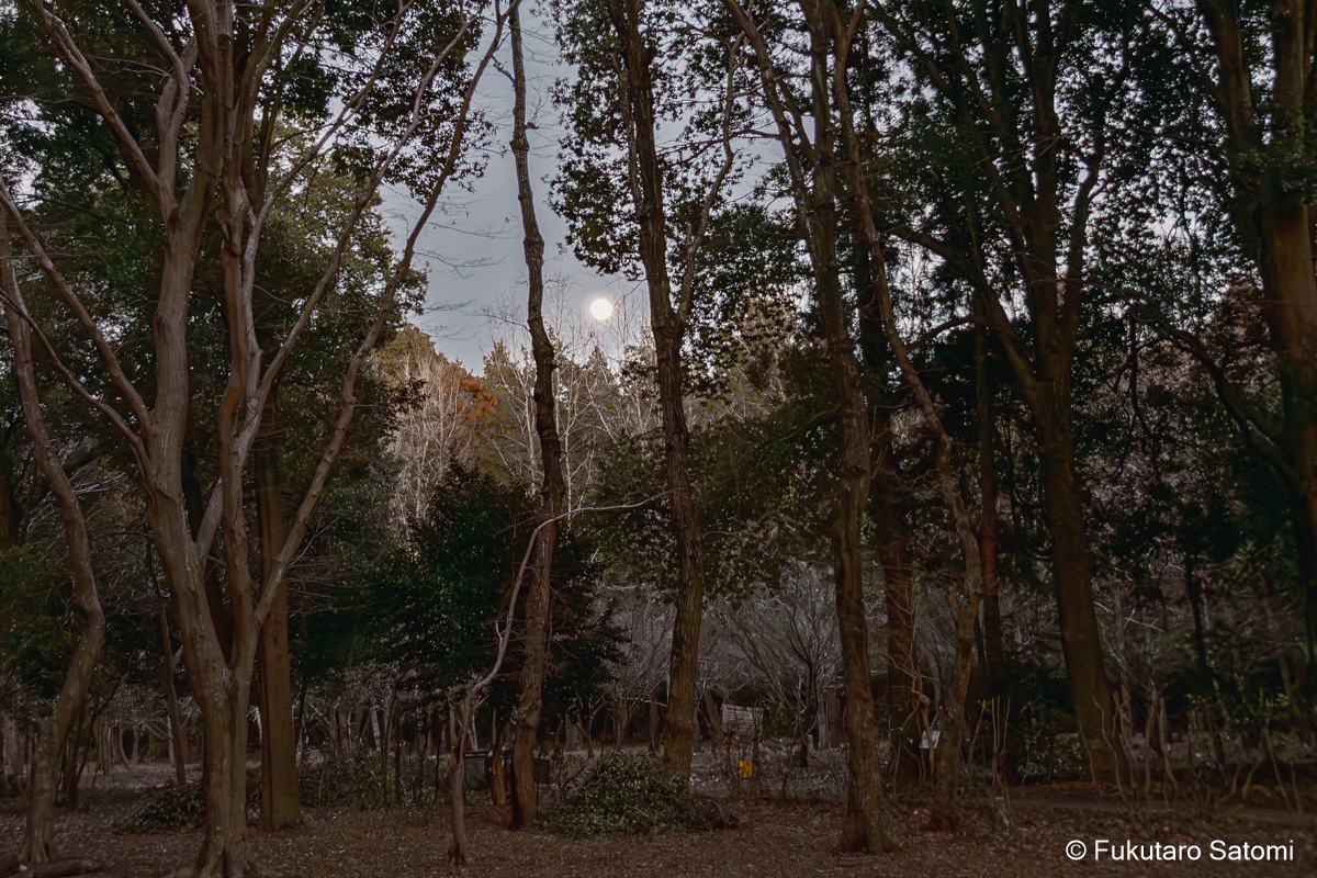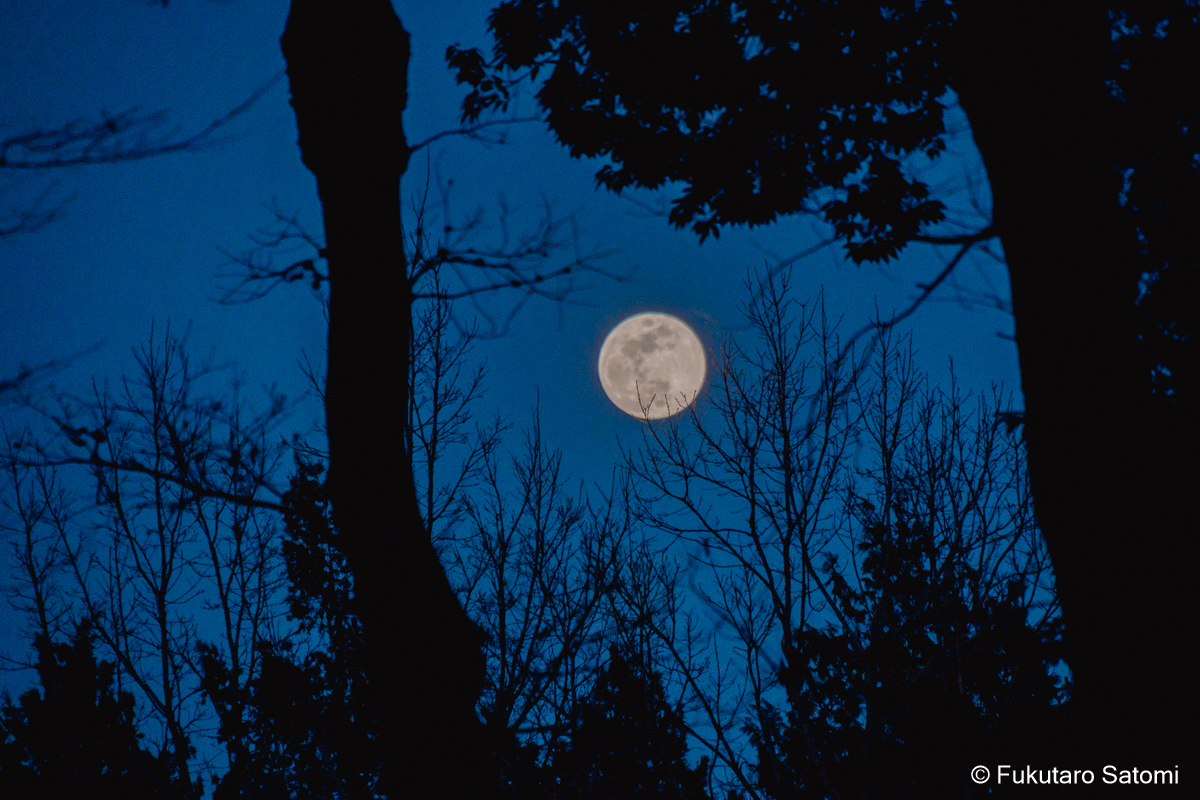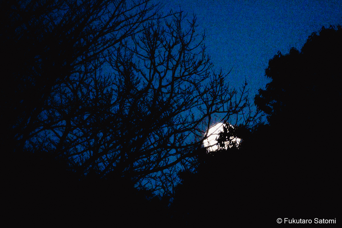月の出は16時16分(千葉)、ふるさと広場だと月の出の時間からだいたい20分ほど経過してから月が見え始める。そのつもりで待っていたのだが、30分過ぎても月は見えてこない。西の空はあかね色、17時10分頃の日の入りを過ぎても、まだ見えてこない。1時間以上経過した17時30分過ぎに、やっと林の木々の間から見えた。
