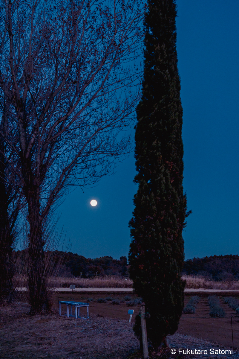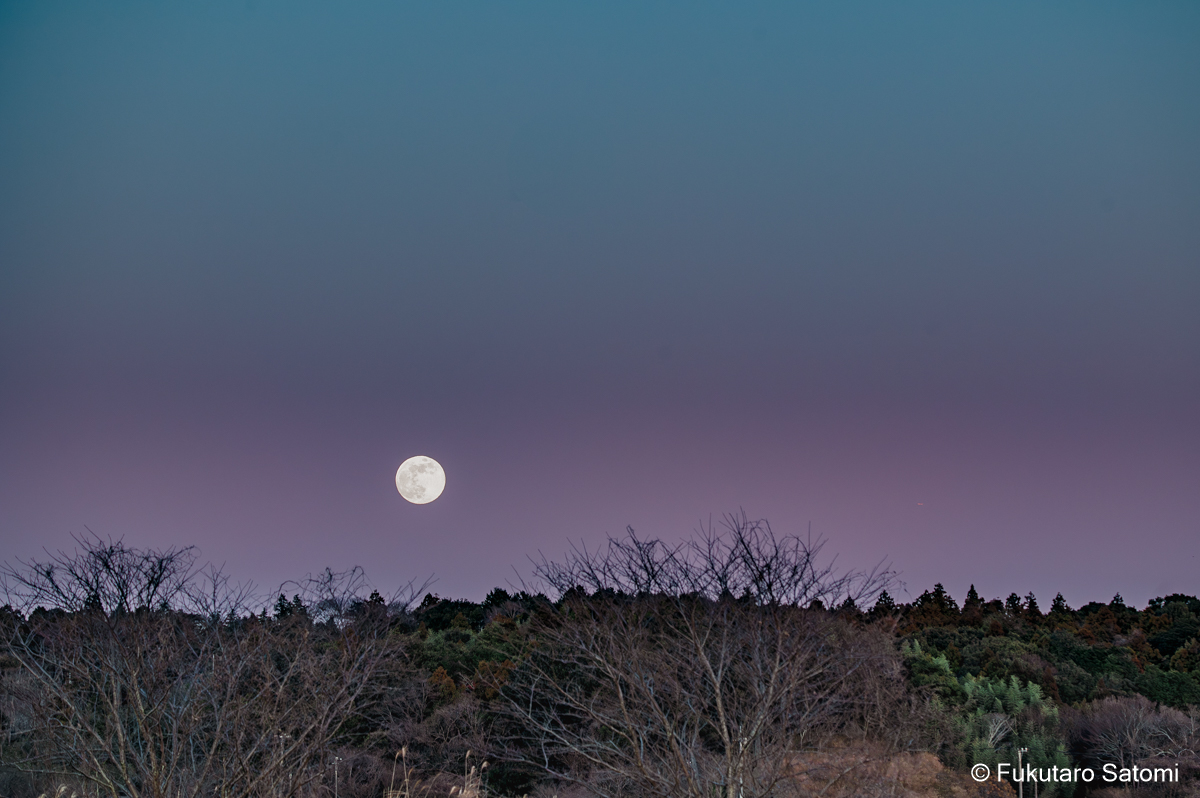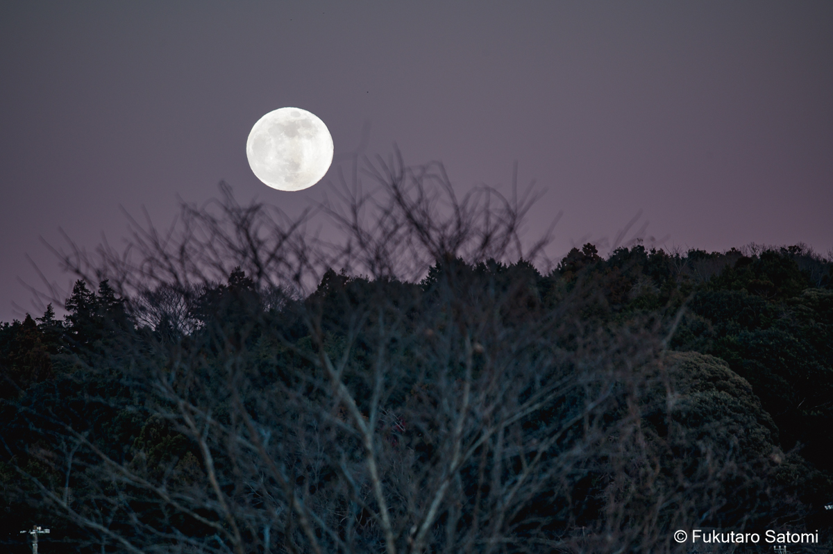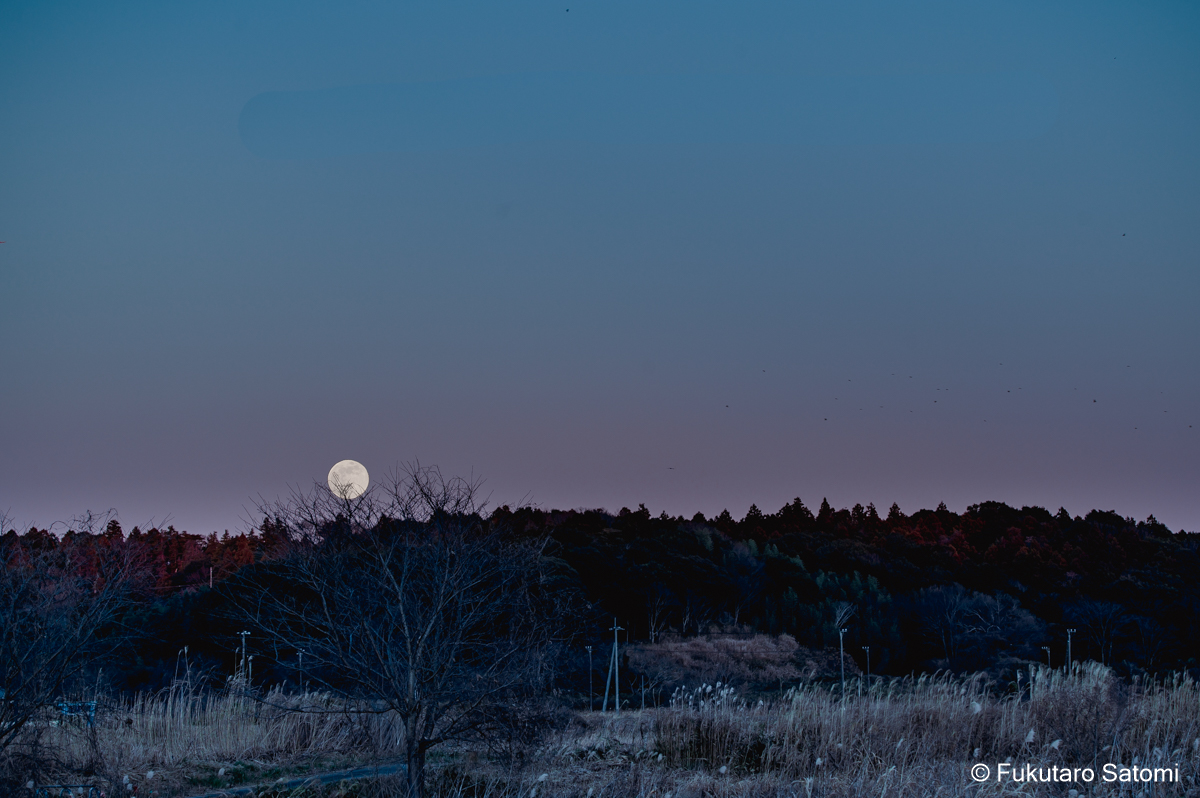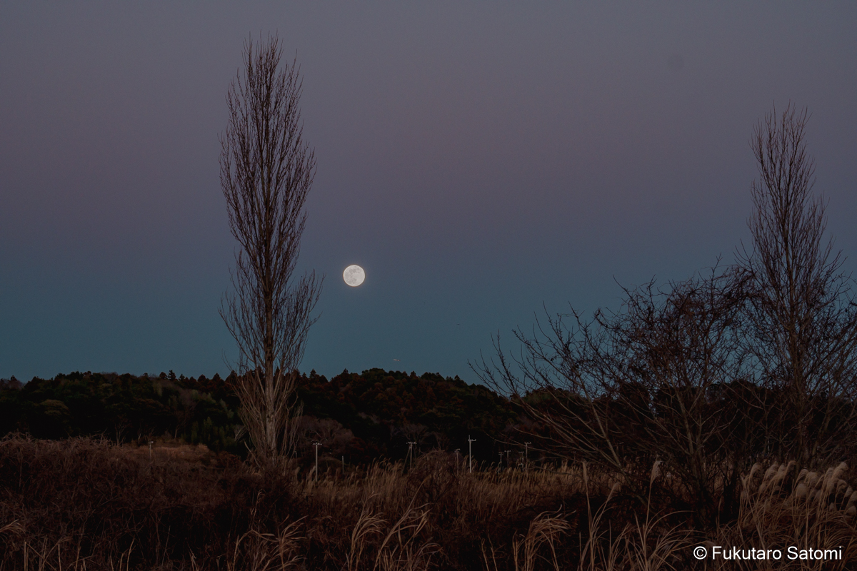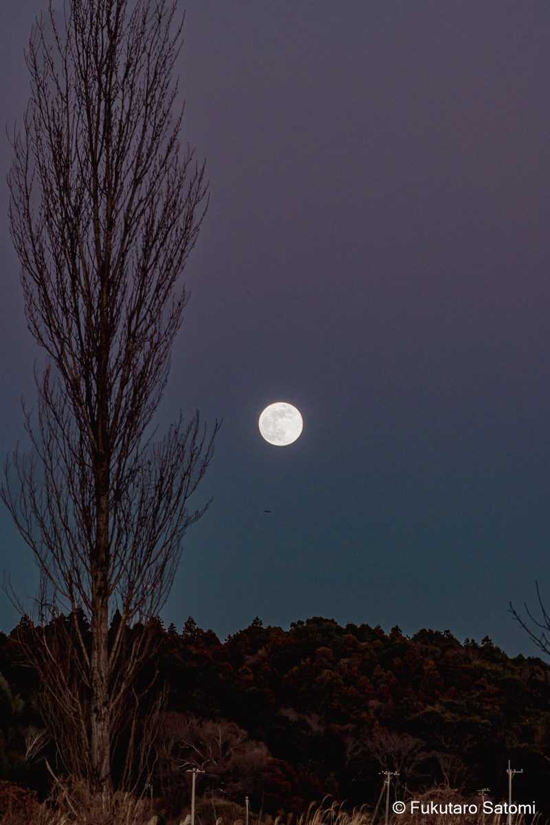 マジックアワーのアイスムーン 満月の昇り始めは、オレンジ色に染まって大きく見えることが多い。冬の寒い時期は、凍てつく空気の中、氷の球体のように白く見える。以前にもそう呼んだことがあったが、今回も「アイスムーン」と呼ぶことにした。