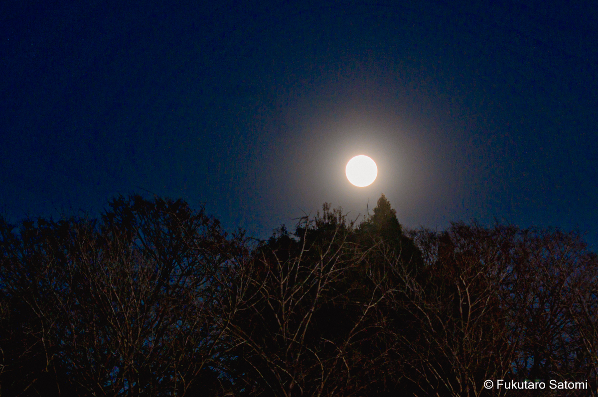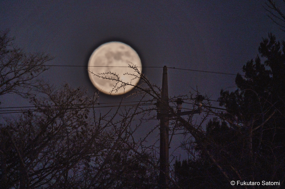 先日城址公園の自由広場で撮影した際、月が昇ってくる方角の確認ができたので、今回の満月は、葉をすっかり落としたイチョウ並木の上に昇る月を撮ることにした。寒波が列島に到来しているそうで、陽が落ちてからは一段と冷え込みが厳しくなってきた。